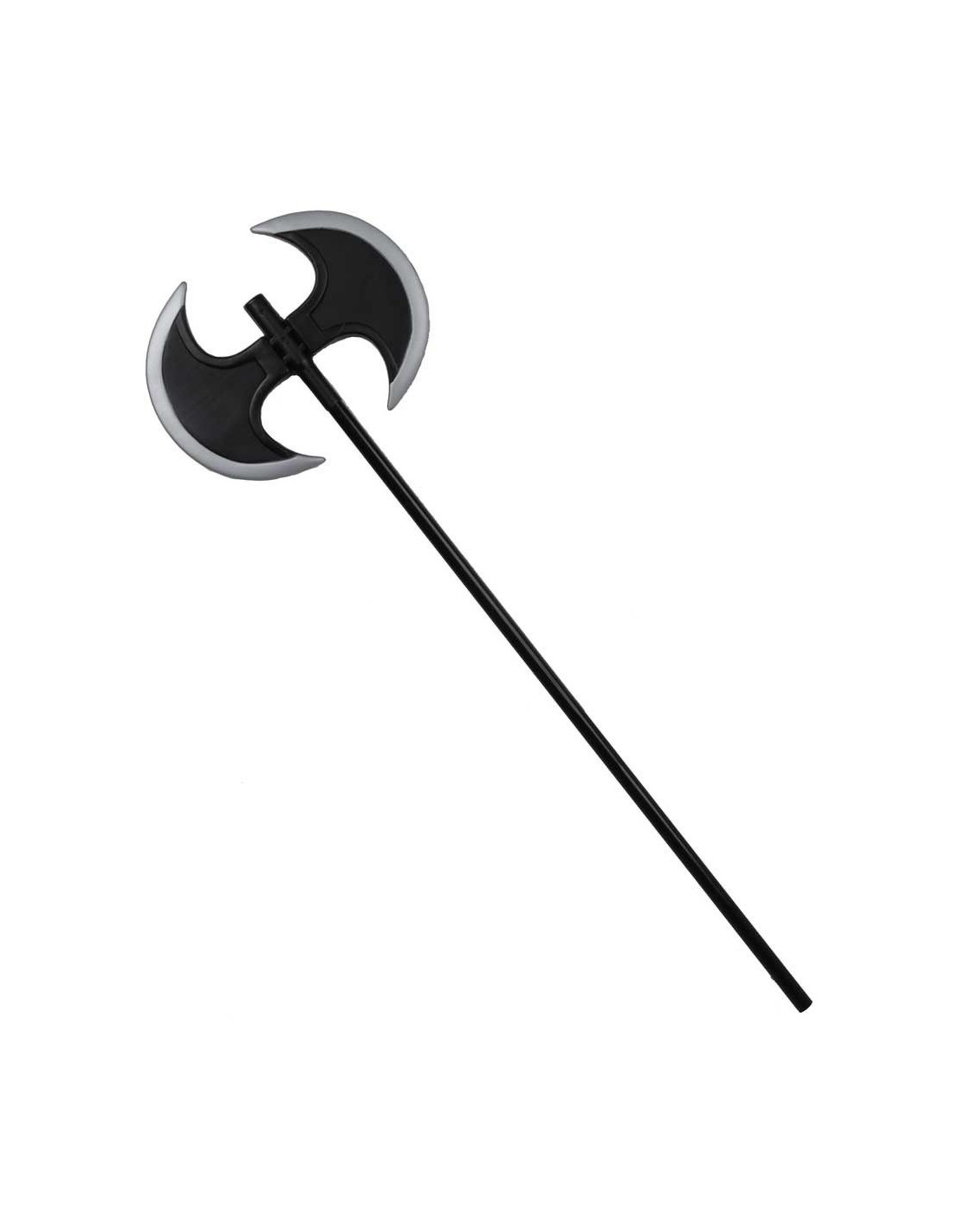 Hacha doble medieval o vikinga fabricada en plástico negro con los dos filos en plata, y con unas dimensiones de 80 x 25cm.
