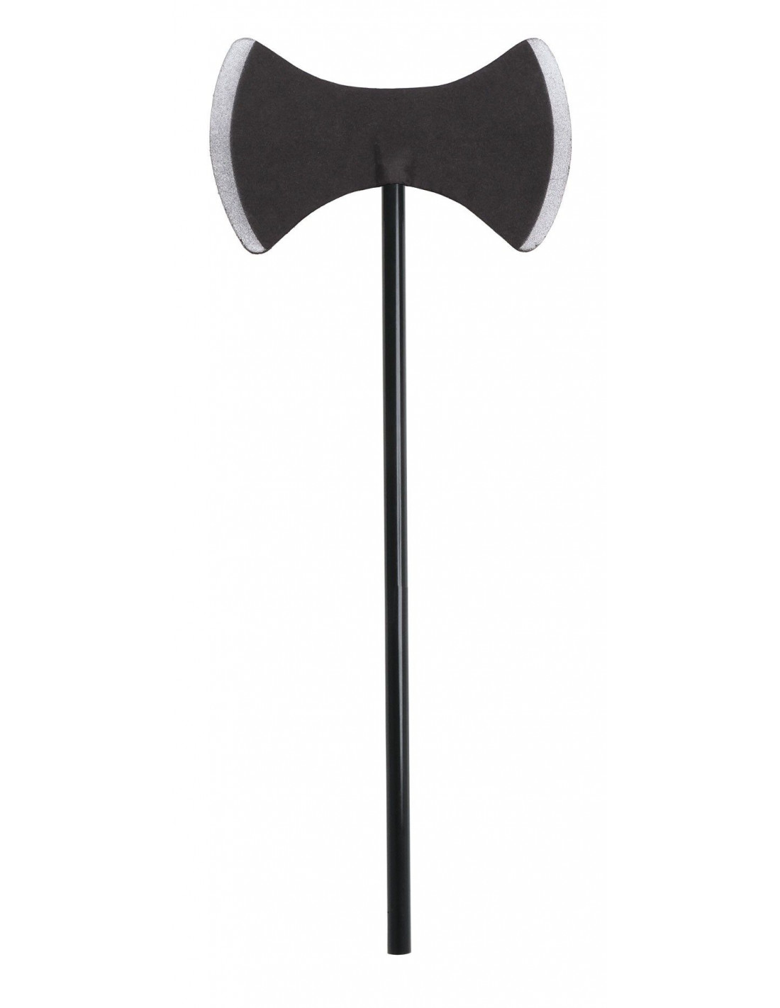 Hacha doble fabricada en goma eva, de tipo medieval, con la que podrás ser un vikingo, un caballero del medievo o incluso un pequeño hobbit. Es de color negro con los filos de ambas hojas en plata. Dimensiones de 100 cm de longitud.