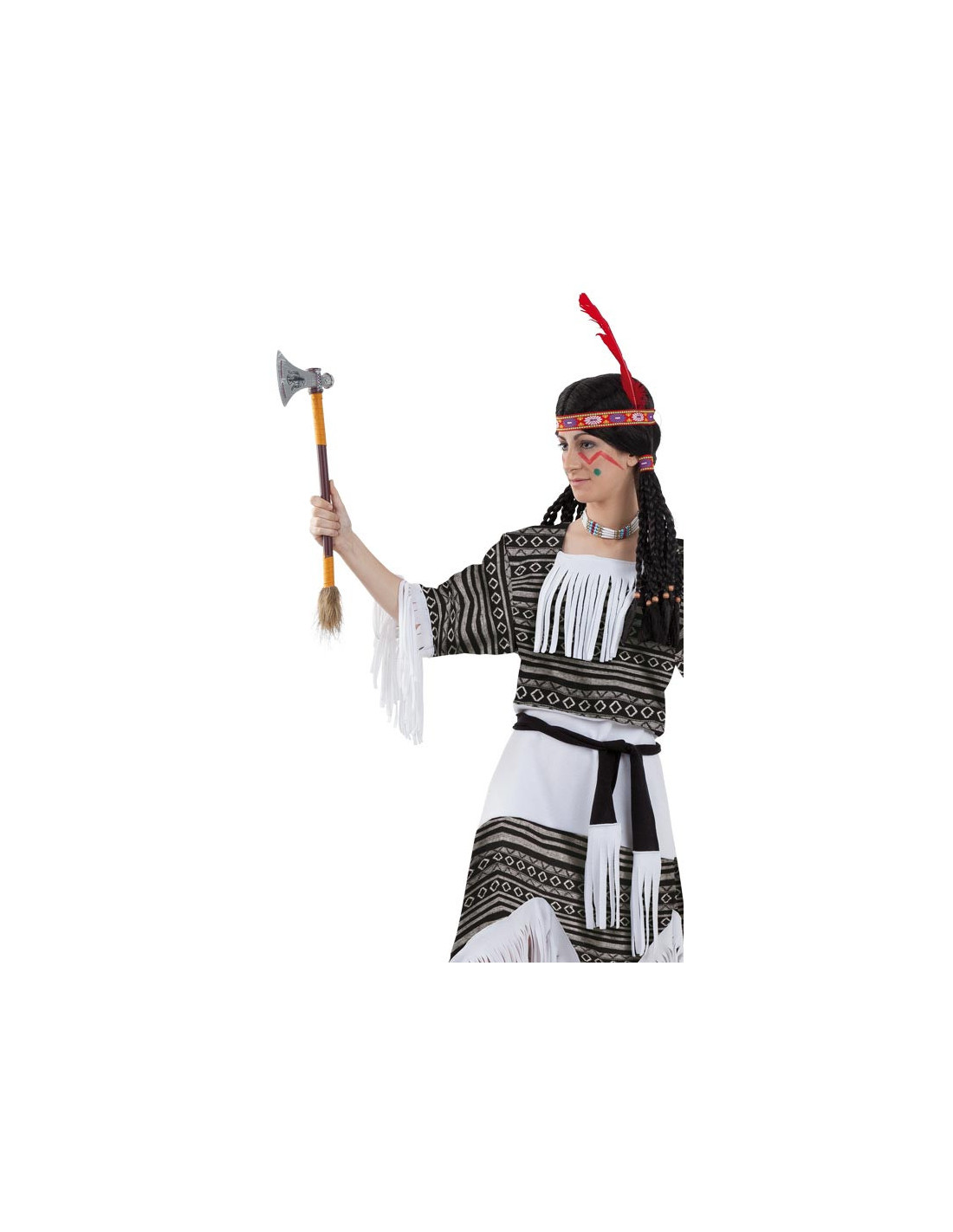 Incluye hacha india tomahawk fabricada de plástico rígido y con dimensiones de 41x16cm.