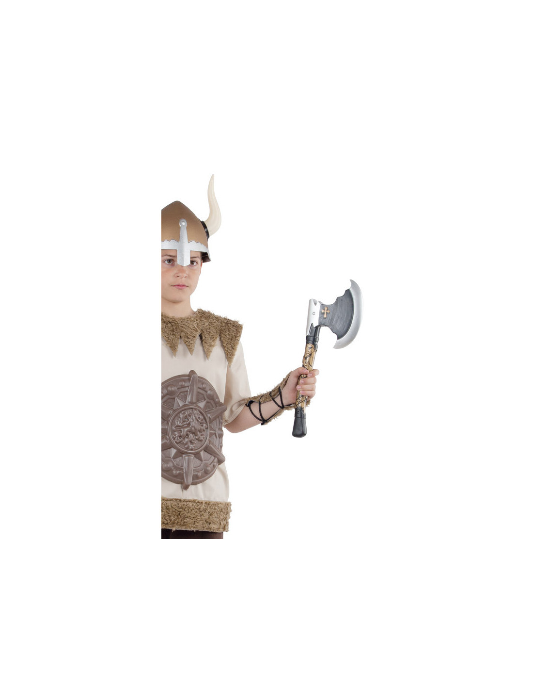 Hacha medieval de guerra fabricada de plástico con el mango en color dorado envejecido e incrustaciones en relieve, hoja en color negro con la cruz templaria incrustada, y filo y contrafilo en plata. Dimensiones de 44x16cm.