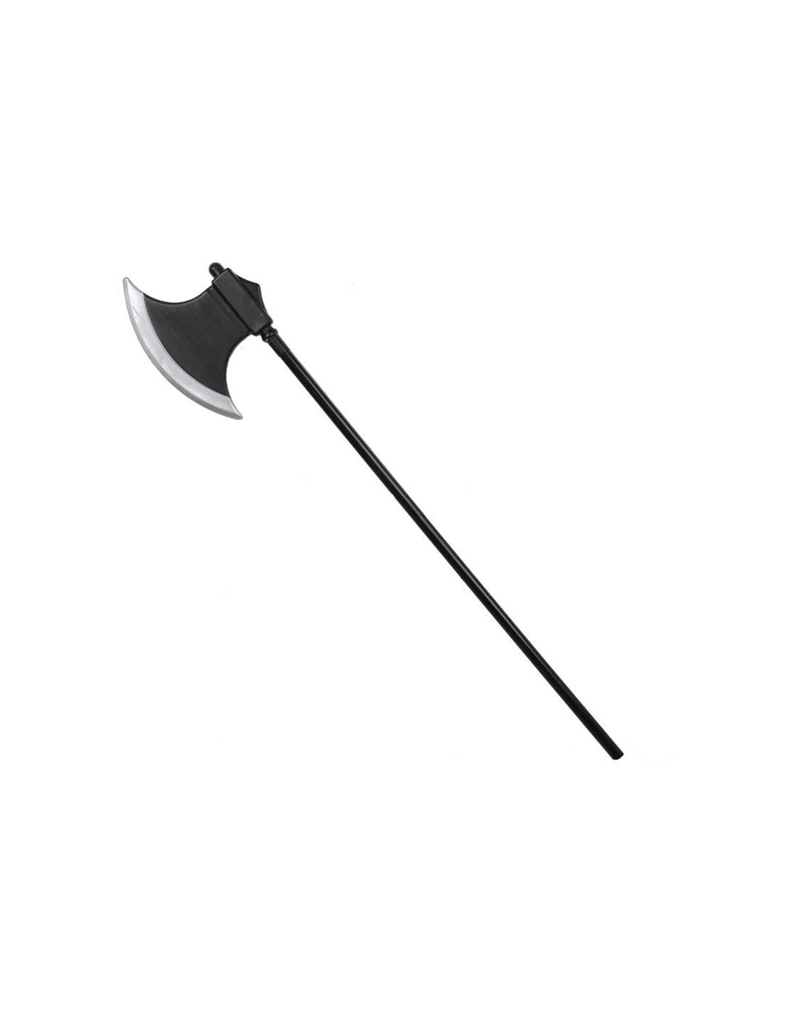 Hacha medieval fabricada de plástico, de color negro con la parte del filo de la hoja en plateado, y con unas dimensiones de 98cm de longitud.