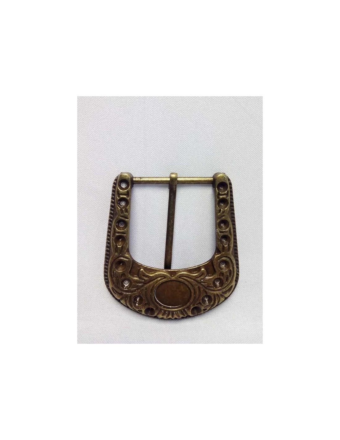 Hebilla para cinturón medieval, en oro viejo y decorada con diferentes motivos ornamentales en relieve. Dimensiones de 6,5x6cm.