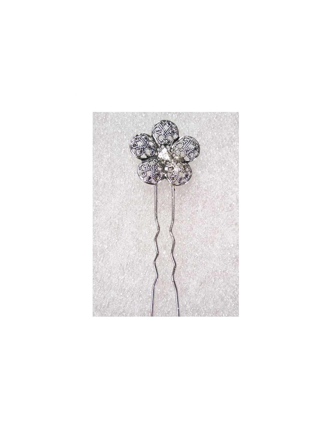 Horquilla regional en forma de flor con 2cm de diámetro y 6cm de púas. Color plata oxidada.