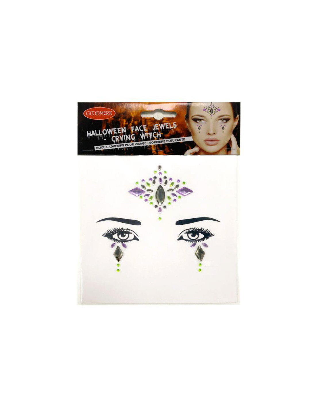 Joyas adhesivas hechicera que incluye un set de piedras adhesivas para la cara con diseño de bruja.