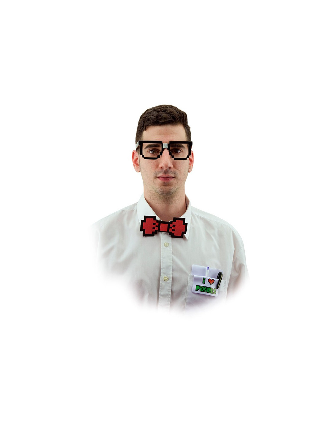 Si lo tuyo es ser un friki y orgulloso de ello, demuestra tu amor por los pixels con este kit friki que incluye unas gafas, pajarita roja y portabolis pixelados.