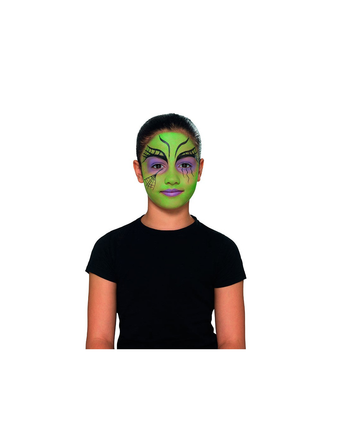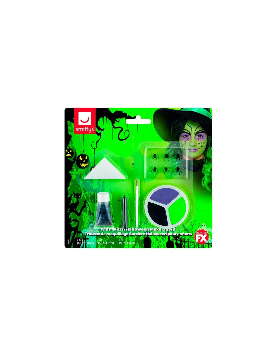 Kit maquillaje bruja infantil que contiene, esponja, pegatinas, pincel y pinturas.