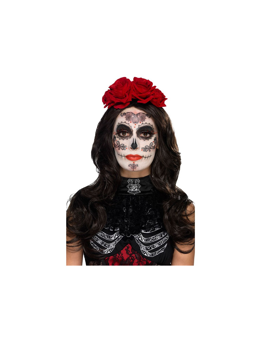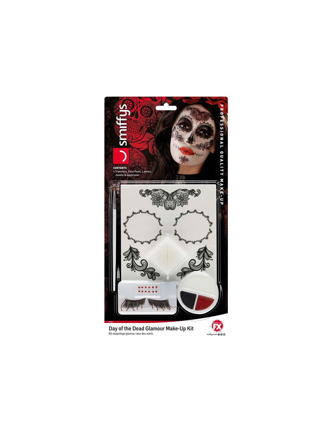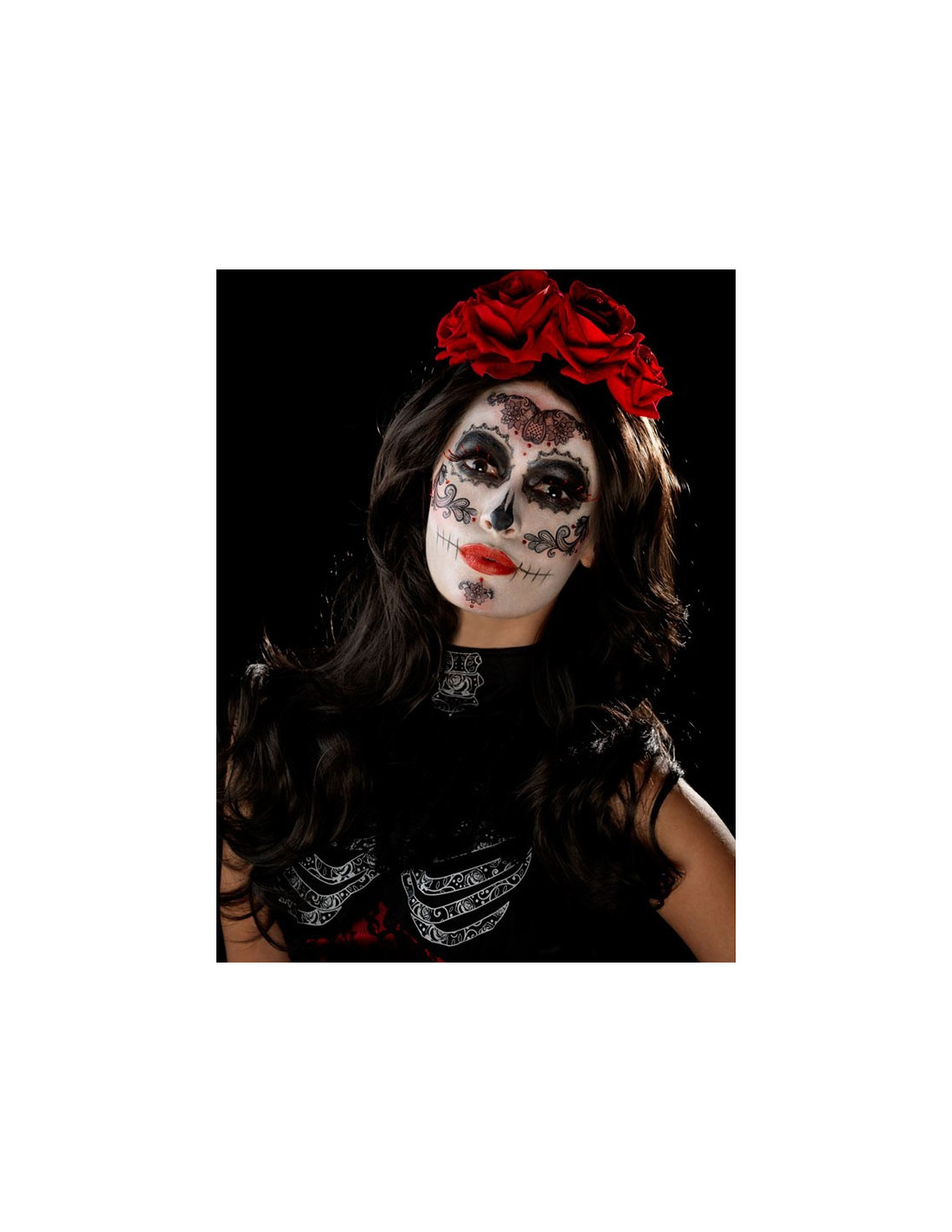 El Kit maquillaje Catrina está formado por una paleta de color negro, blanco y rojo para pintar la cara, una esponja, un pincel, transferencias, pestañas negras con pequeñas joyas incrustadas en las puntas y joyas adhesivas rojas para darle el toque final.