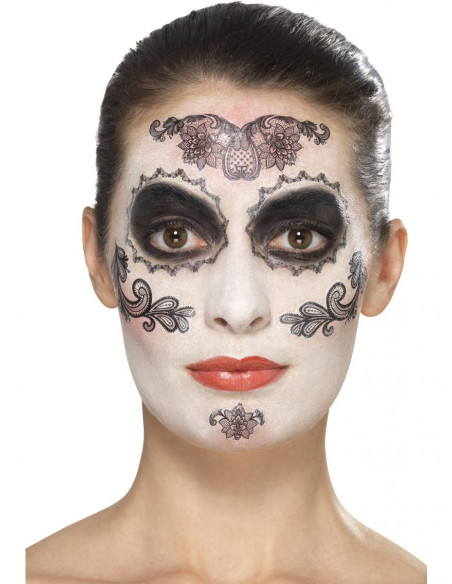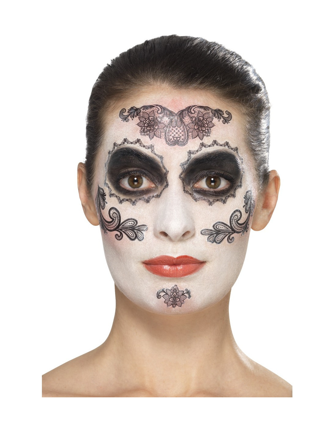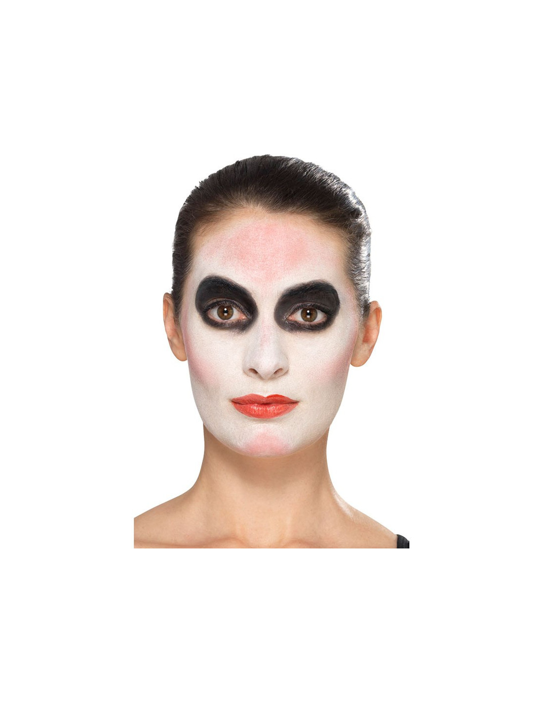 El Kit maquillaje Catrina está formado por una paleta de color negro, blanco y rojo para pintar la cara, una esponja, un pincel, transferencias, pestañas negras con pequeñas joyas incrustadas en las puntas y joyas adhesivas rojas para darle el toque final.