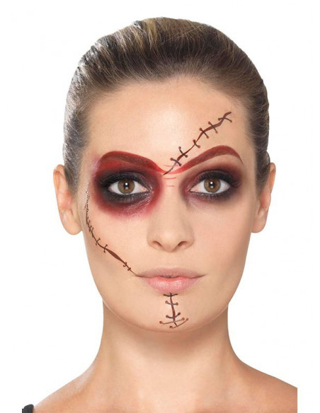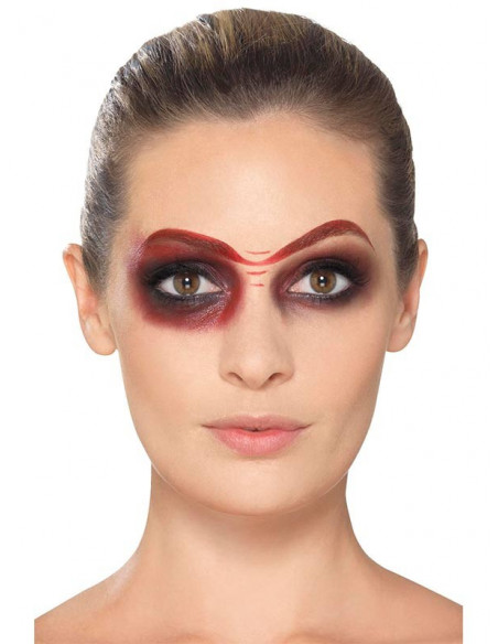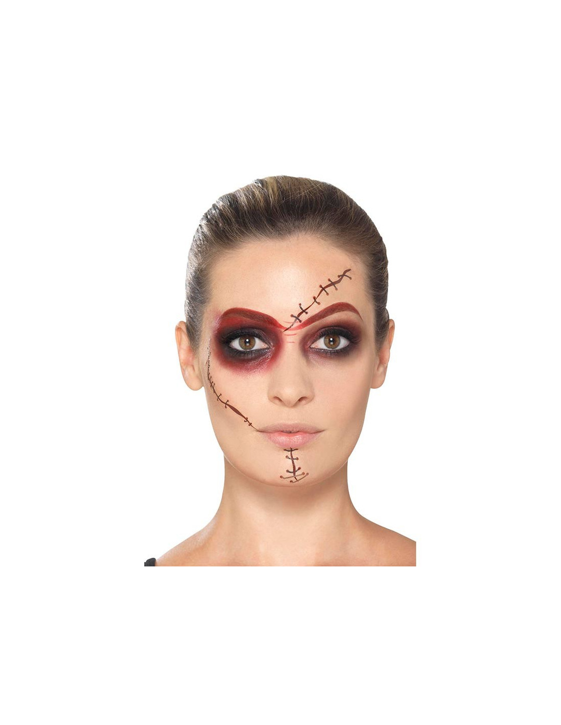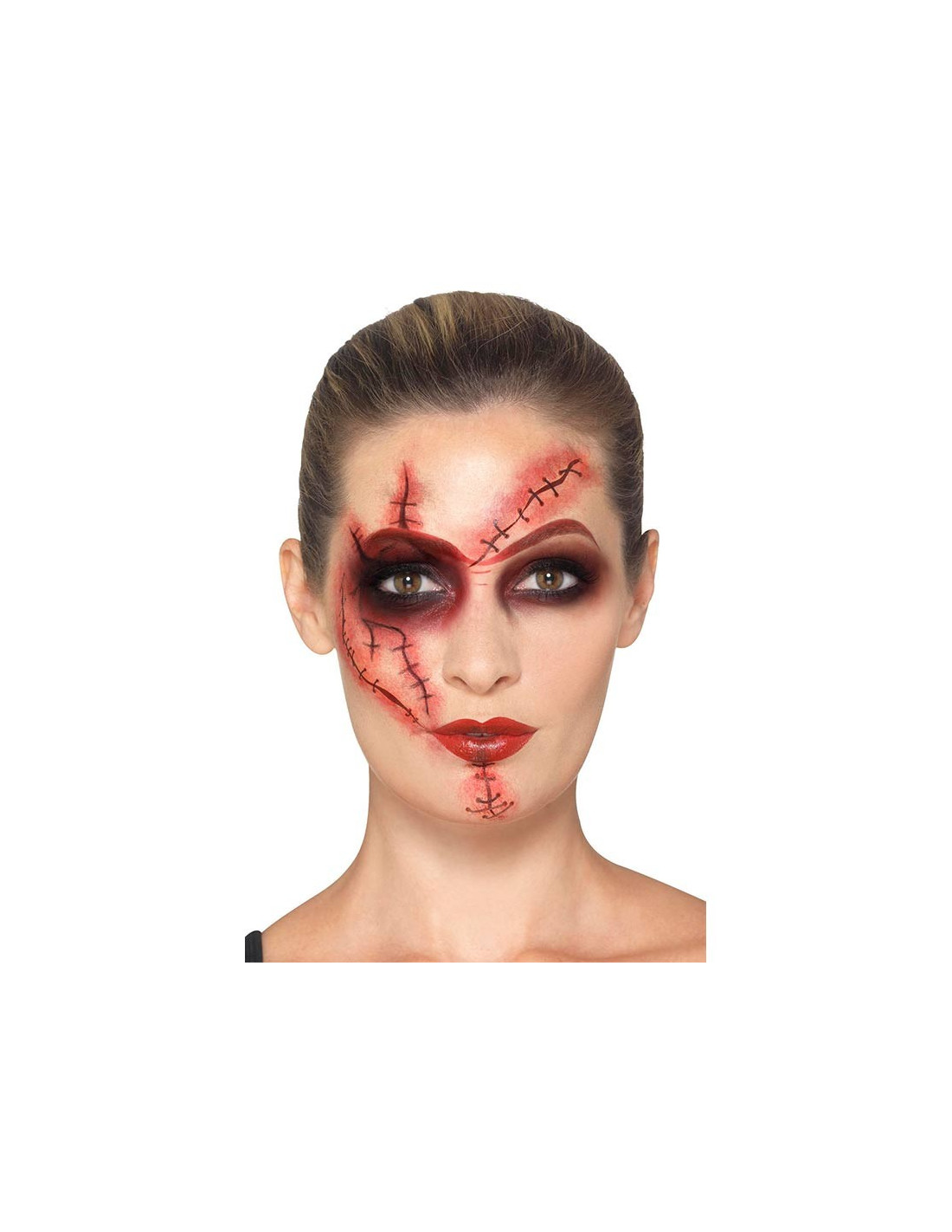 Kit maquillaje Chucky que incluye maquillaje al agua rojo y negro, pincel y tatuajes temporales de cicatrices.