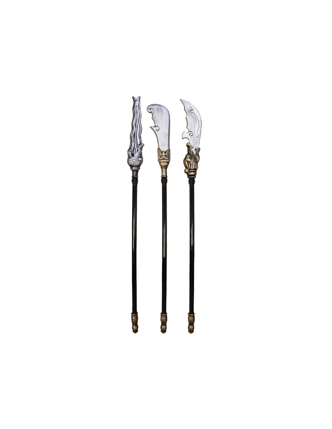 Lanza de plástico decorada con motivos de la Edad Media. Con unas dimensione de 85 cm de longitud, el mástil es de color negro, la empuñadura dorada con motivos ornamentales en relieve, y la parte que une el mástil con la punta está disponible en diferentes modelos: la cabeza de un cocodrilo, la cabeza de un dragón o de un guerrero. Se venden en modelos surtidos, puede indicar qué modelo quiere pero se enviará en función de su disponibilidad.