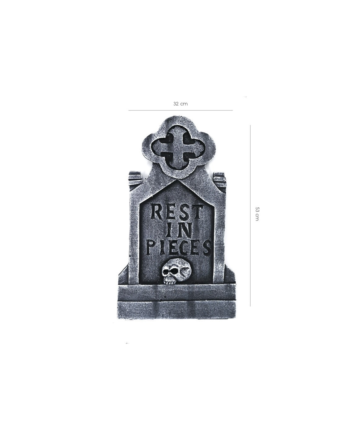 Lápida Halloween Rest in pieces que mide 53cm x 32cm aproximadamente.