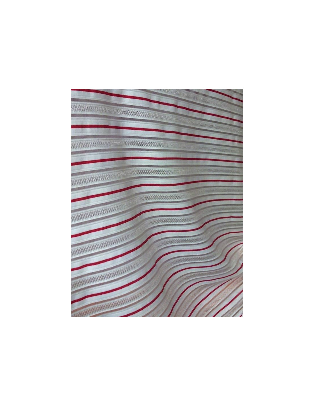 Licra blanca con rayas fucsias, de tul y blonda blanca.Tiene  composición de 82% poliamida brillante y 18% elastano. El ancho del tejido es de 150 cm.