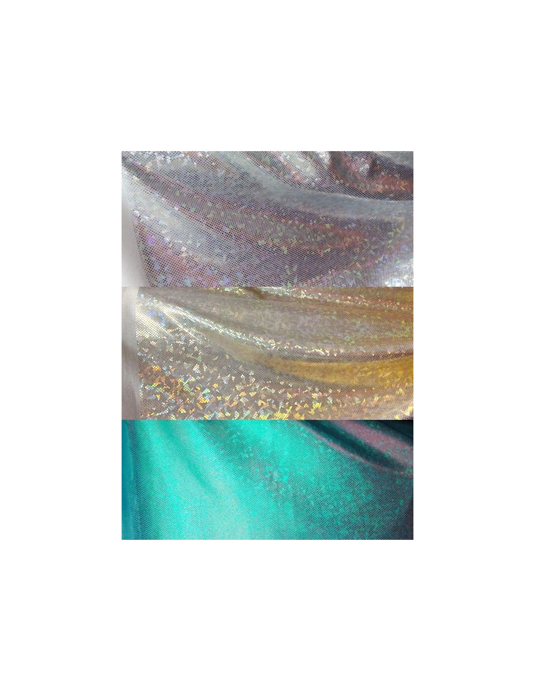 Lycra Lamé metalizada por metros ideal para la confección de disfraces como morphsuits (monos ajustados de cuerpo entero), maillots o camisetas. Este tipo de tejido, compuesto en 80% de poliéster y el 20% de spandex, destaca por su ajuste total al cuerpo del portador y por su elasticidad en todas direcciones. Disponible en color blanco, turquesa y oro, con un ancho de 150 cm la pieza. Se vende por metros.