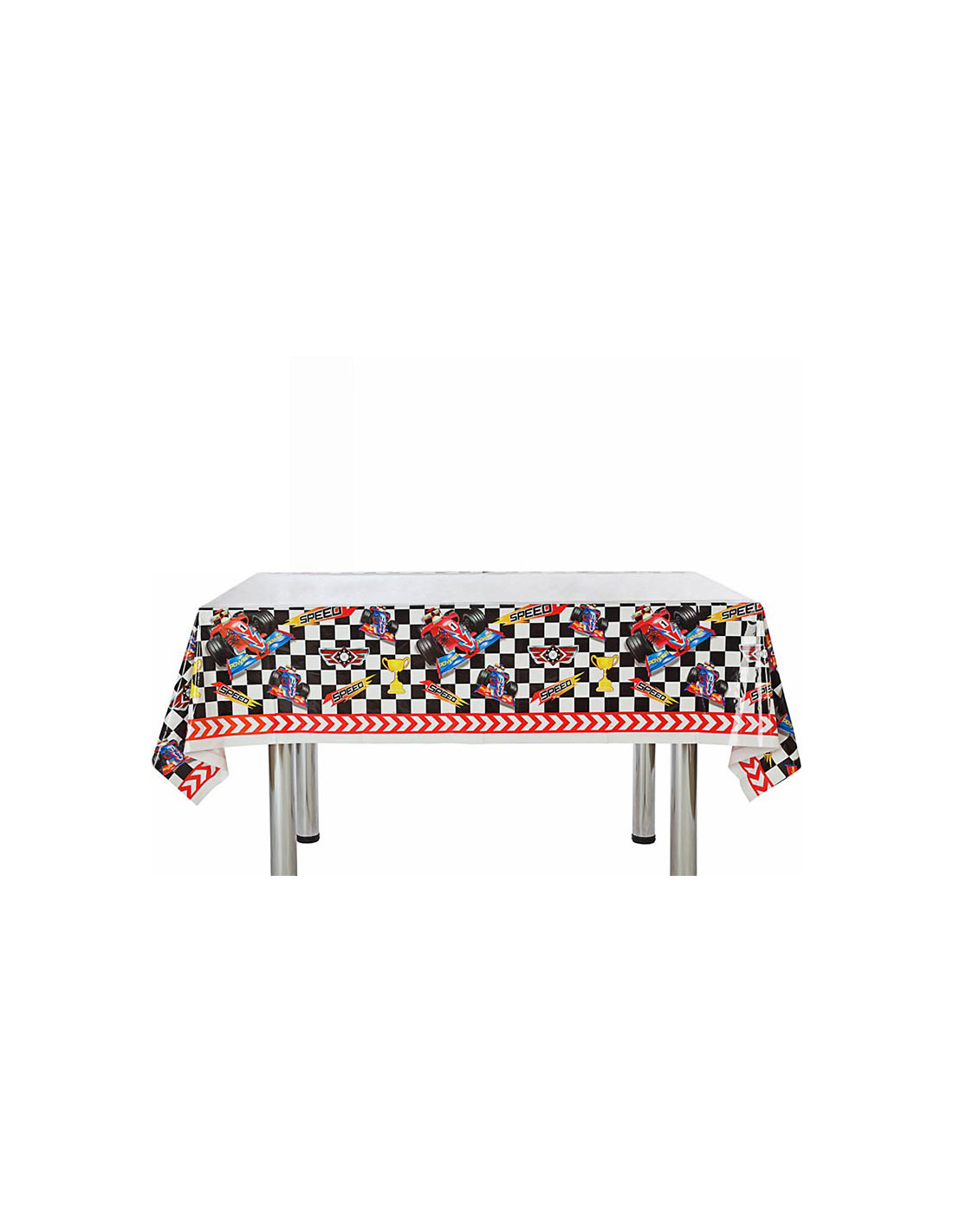 Mantel coches fórmula uno de plástico que mide 137x182cm.