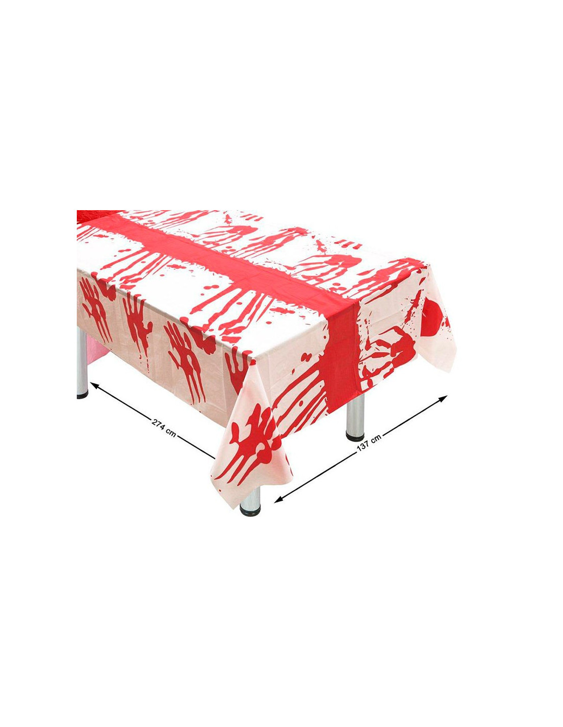 Dale el toque tétrico a tu cena en la noche de Halloween y ambienta tu casa o local para tus invitados. Este mantel de Halloween sangre es de plástico con manos impresas en color sangre y diversas manchas. Tiene unas medidas de 274x137cm.