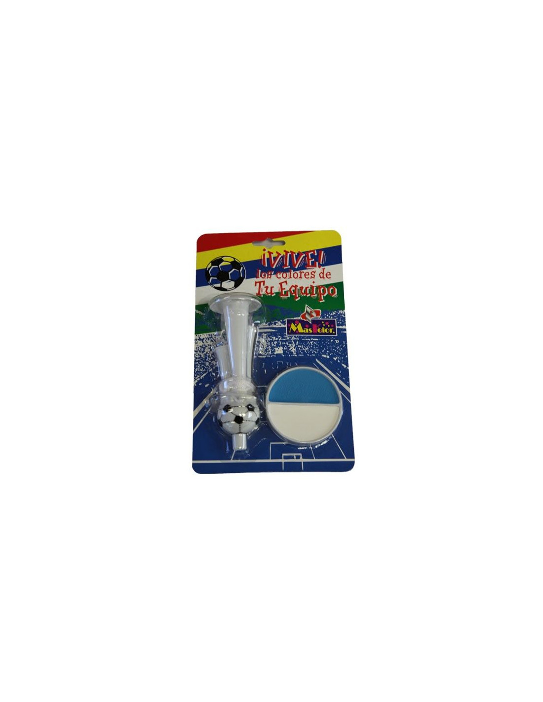 Píntate los colores de tu equipo y anímalo soplando la trompeta como si no hubiera mañana. El maquillaje es graso , ideal para poder difuminar ya que no termina de secarse. Esta en los colores: Azul-Blanco, Azul-Marron, Blanco-Negro, Blanco-Verde, Rojo-Amarillo.