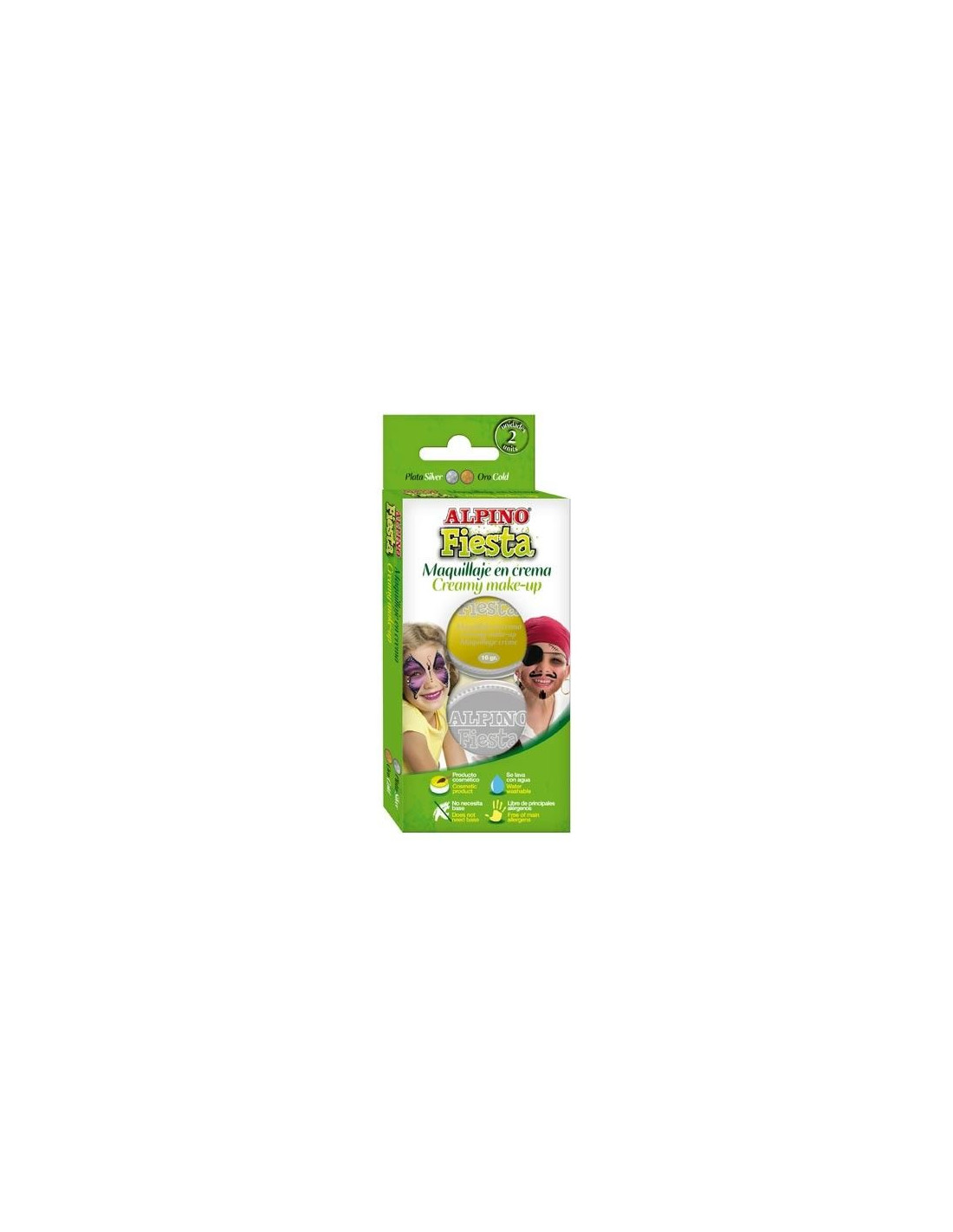 Caja de 2 tarros de maquillaje en crema de 16gr cada uno en plata y en dorado.Es una pasta fácil de aplicar, tanto con los dedos como con esponja, y de lavar. Ademas cumple todos los requisitos sanitarios pudiéndose aplicar incluso a niños de corta edad.