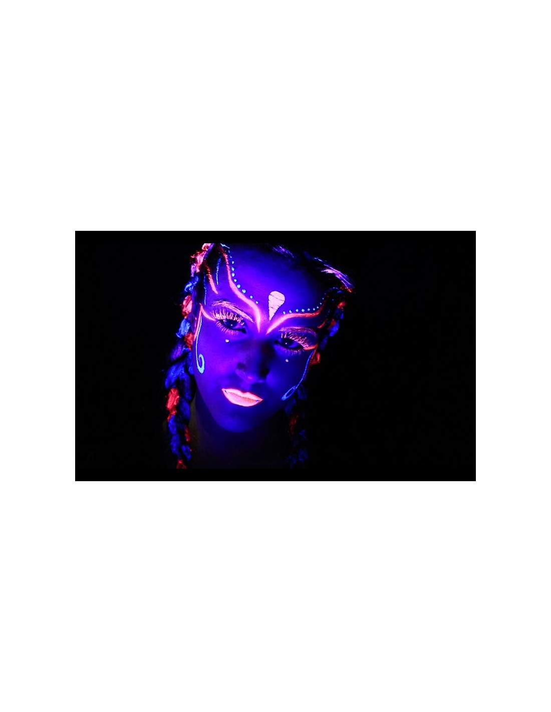 Maquillaje Rosa Flúor Ultravioleta con gran intensidad, brillo y espectacularidad. Son colores fluorescentes bajo la luz negra y vibrantes en luz natural.