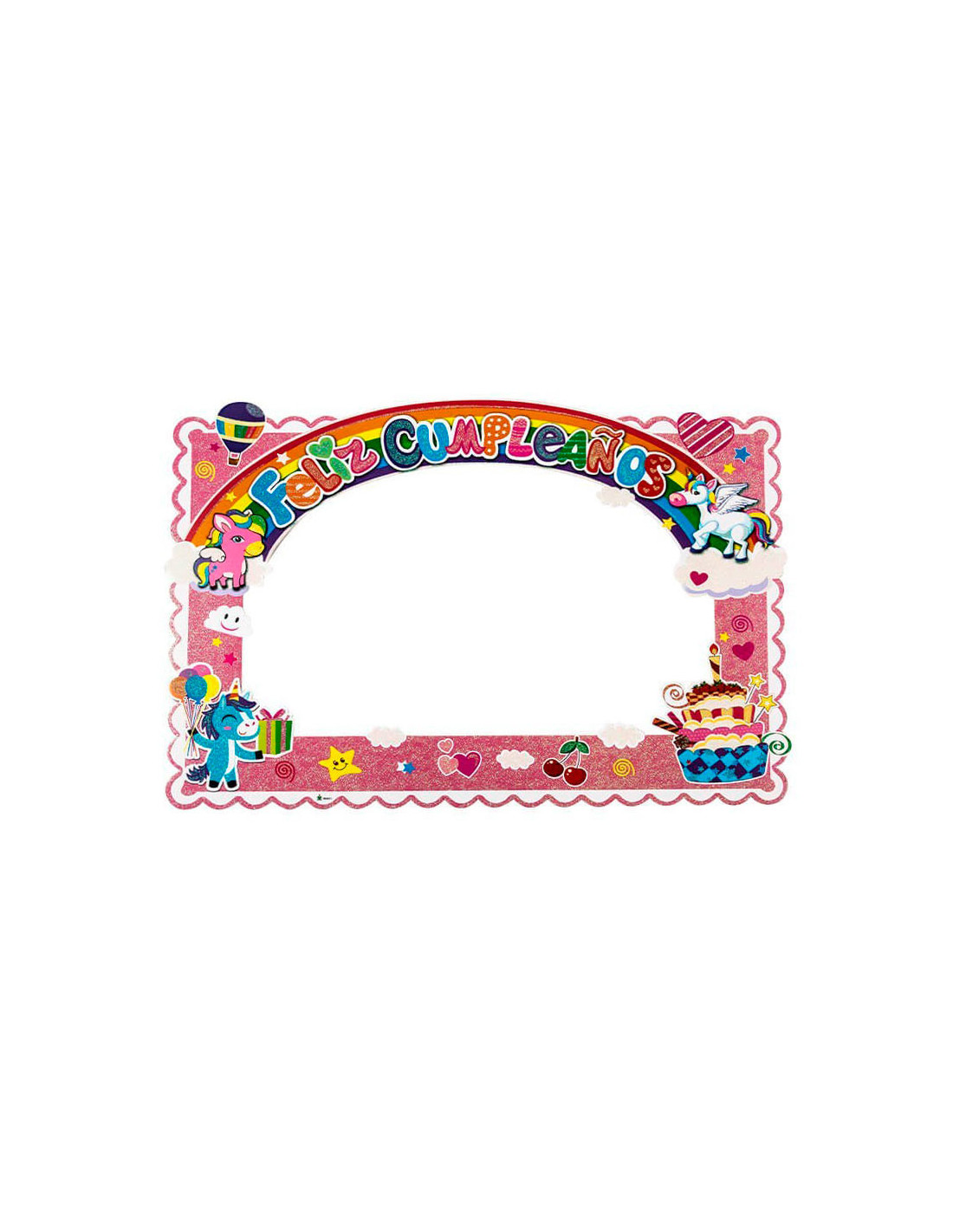 Marco photocall cumpleaños rosa de cartón pluma que mide de 80x60cm aproximadamente.