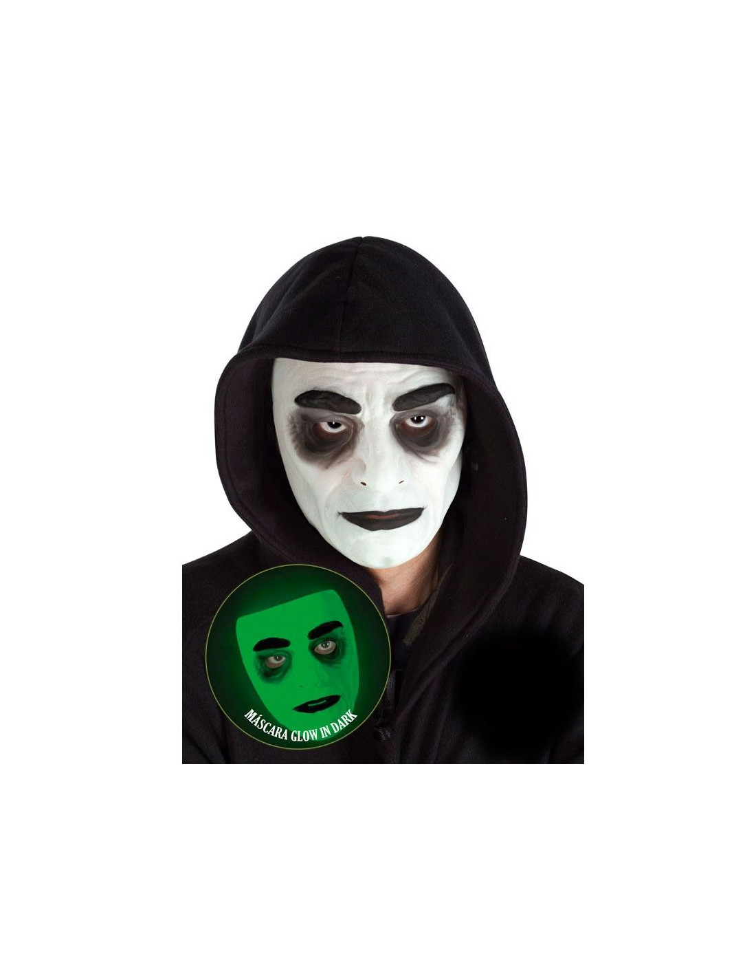 Máscara de Darkman para Halloween con la que brillarás en la oscuridad. Es de color blanca, con ojeras negras grandes debajo de los ojos, y labios y cejas del mismo color.