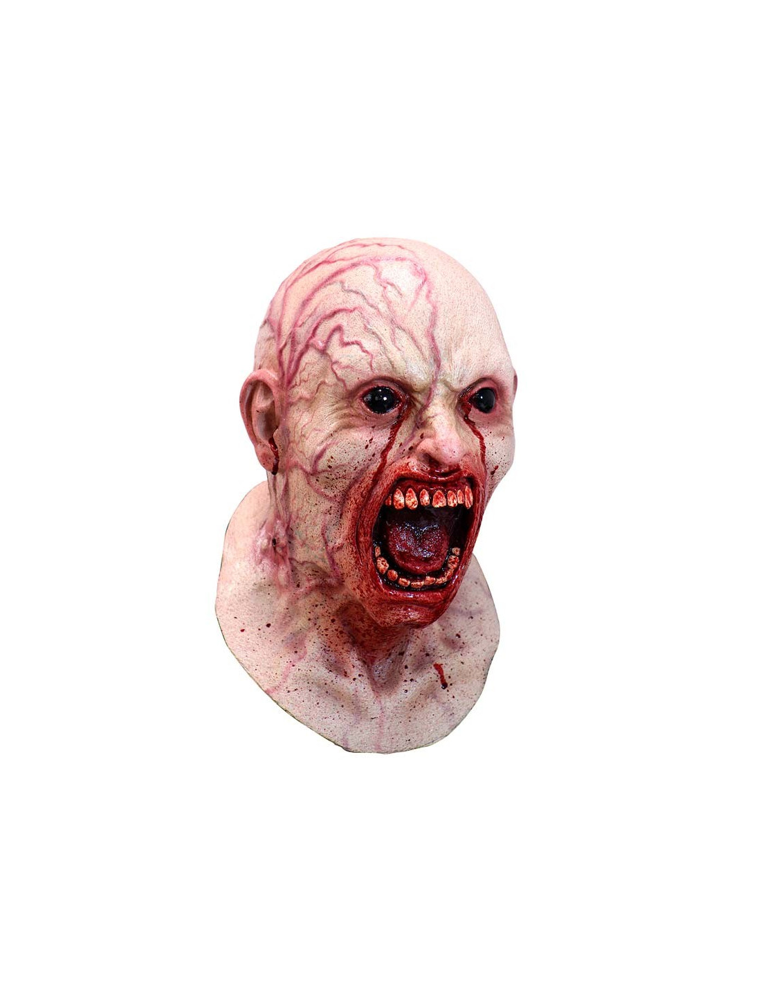 Máscara de Zombie infectado para adulto, fabricada de látex, con las venas de la cara enrojecidas y muy hinchadas, la boca abierta llena de sangre y los ojos totalmente negros y brillantes. Incluye parte del cuello.
