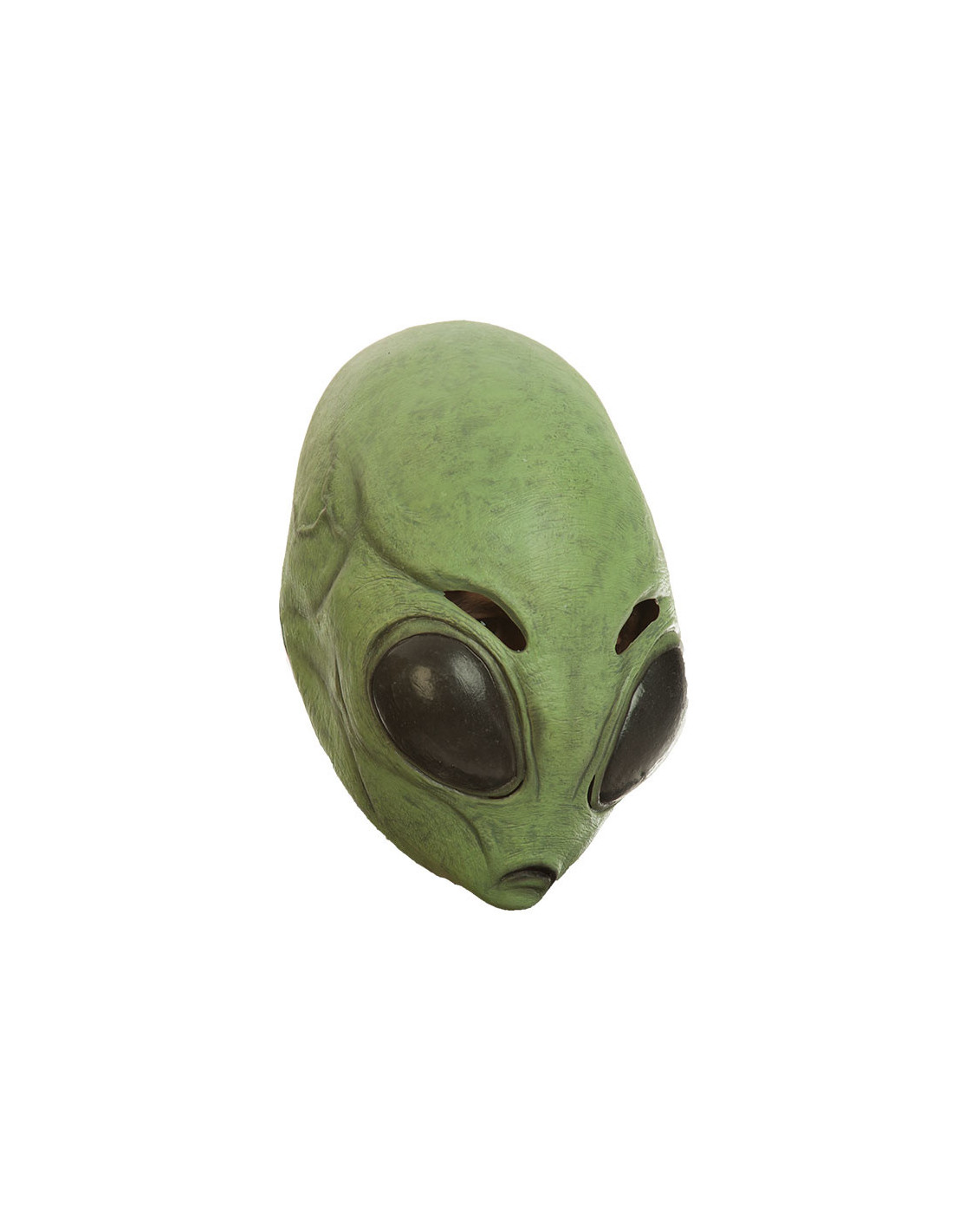 Contiene una máscara verde de látex con grandes ojos negros que cubre la cabeza.