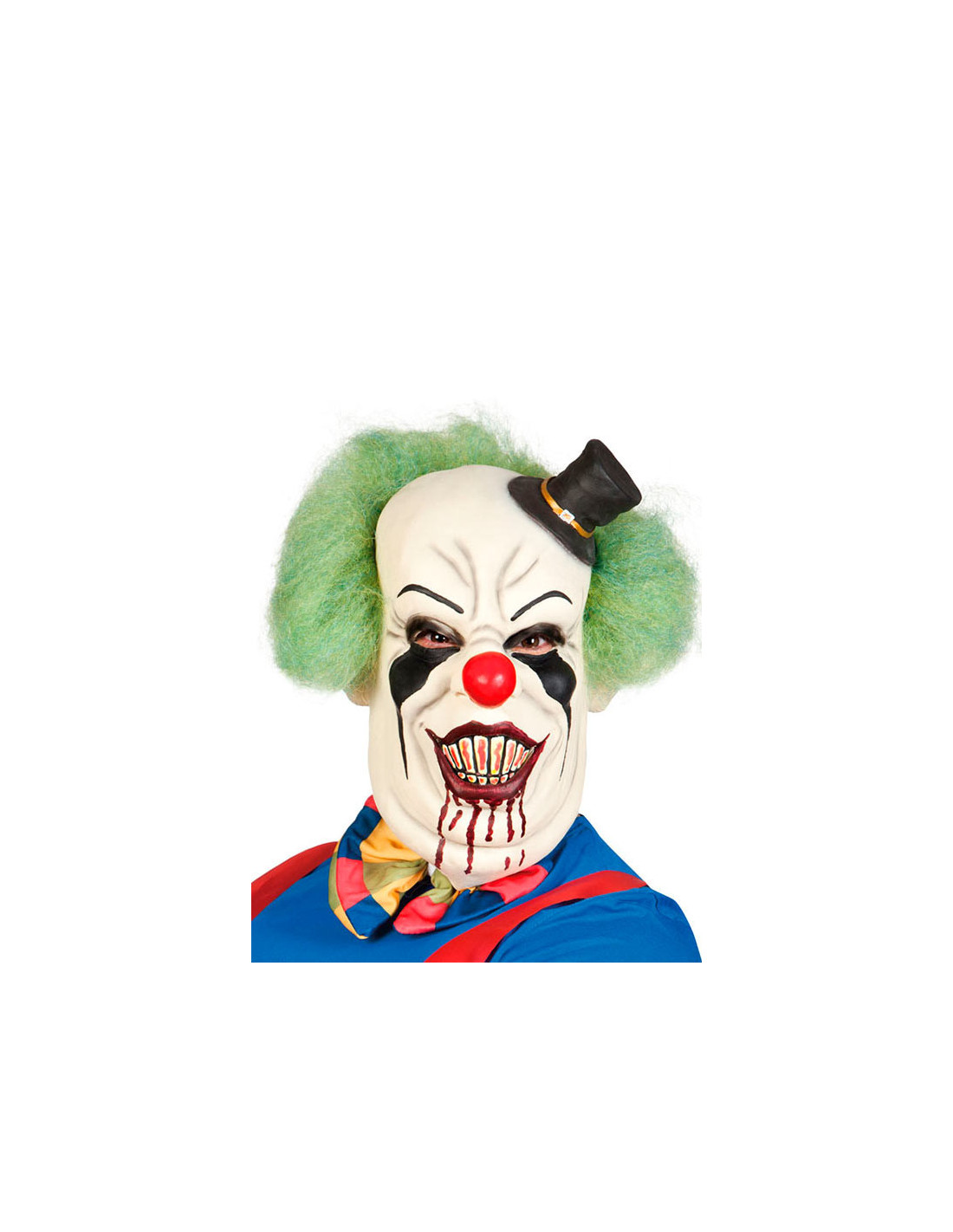 Esta máscara de payaso aterrador es de látex y de gran calidad. Tiene una mini chistera en un lateral, pelo sintético verde y gran detalle en las facciones.