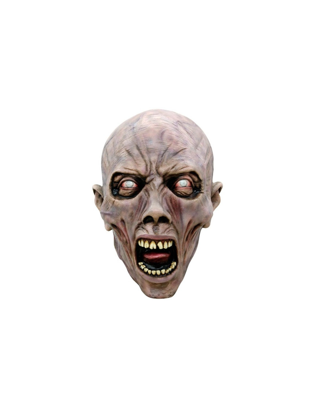 Máscara de zombie fabricada de látex con multitud de detalles terroríficos: arrugas muy marcadas y boca abierta.