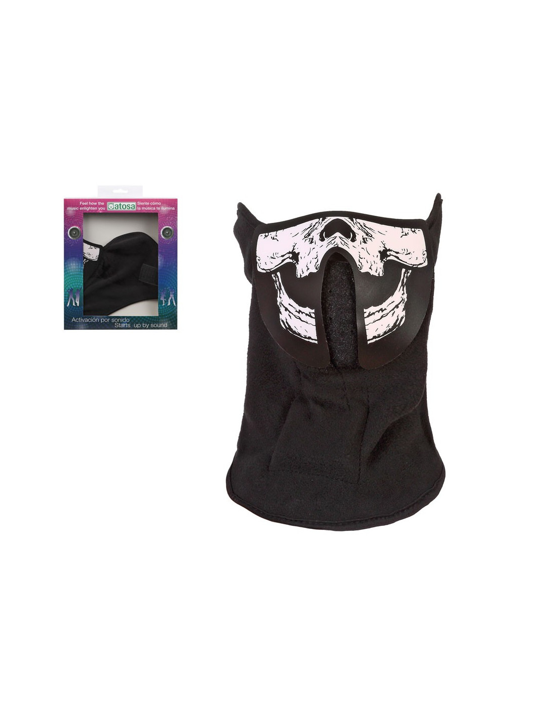 Máscara esqueleto con luz formado por un cuello de tela con estampado de esqueleto que se ilumina con luz led. Funciona con dos pilas AAA- 1,5V, no incluidas. Instrucciones en el interior.