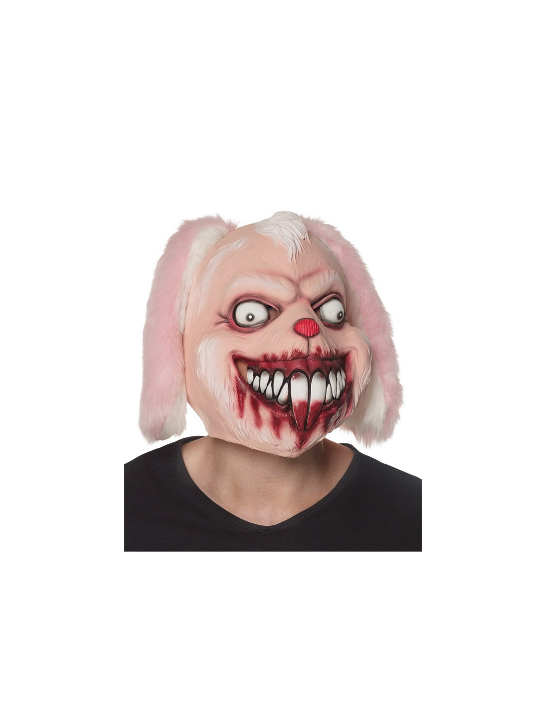 Máscara conejo terrorífico de látex con orejas de pelo rosa y blanco.