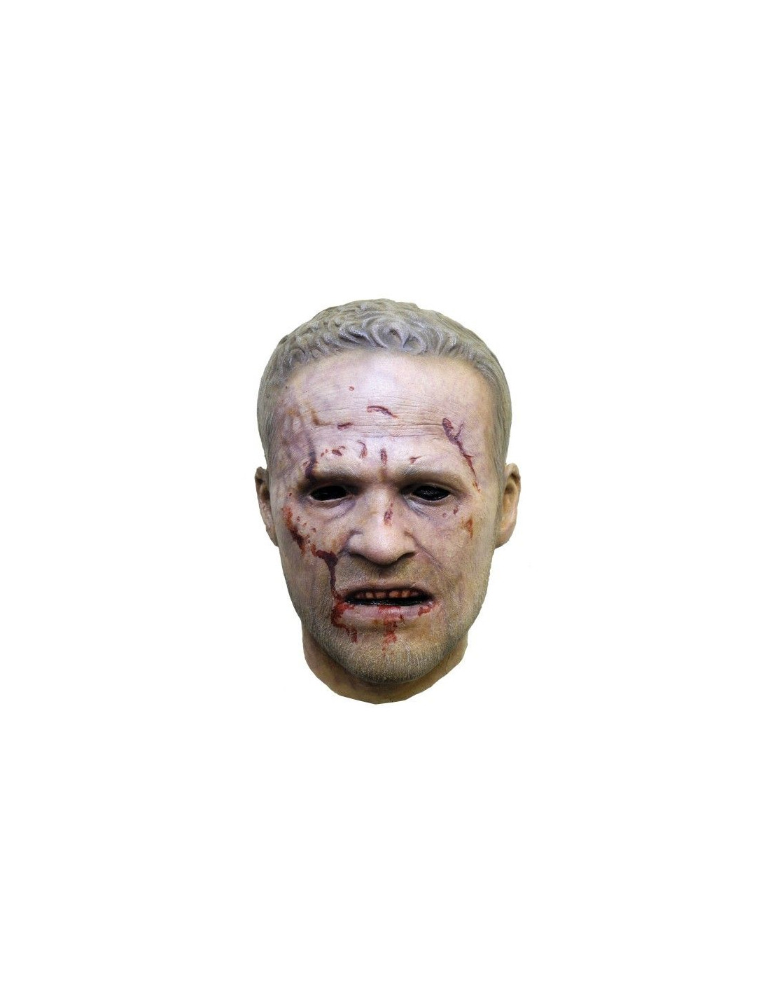 Máscara Merle para convertirte en uno de los personajes de la serie The Walking Dead. Esta sangrienta máscara de Merle Dixon de látex, tiene la piel pálida, ojeras y bolsas debajo de los ojos negros, cortes y heridas con sangre por toda la cara, líneas de expresión marcadas, pelo y barba rubios, y la boca llena de sangre con los dientes manchados.