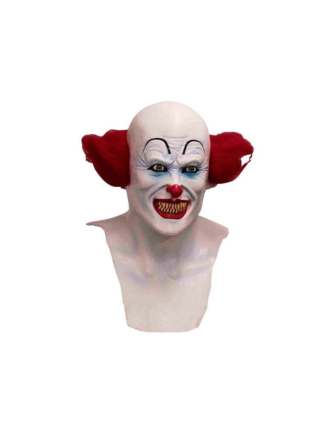 Máscara Scary Clown para adulto, fabricada de látex,con la piel blanquecina, con calva y pelo rojo en los laterales, realistas arrugas y todos los dientes son colmillos como en la famosa película It Pennywise. Incluye parte del cuello.