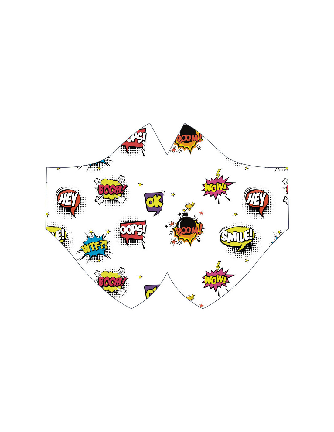 La mascarilla cómic es perfecta para los fans de los superhéroes. Sobre un fondo blanco se estampan los bocadillos más característicos de los cómic.