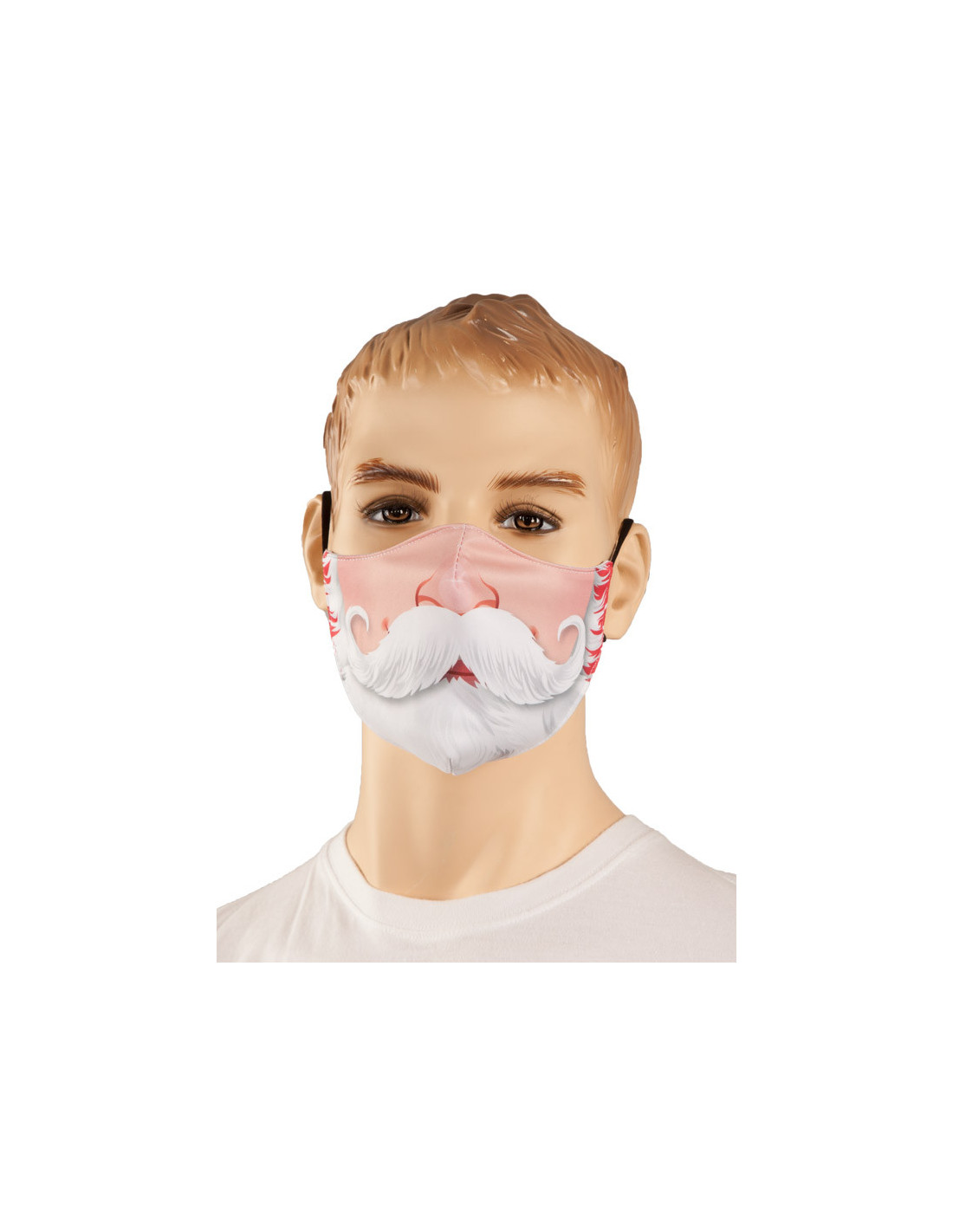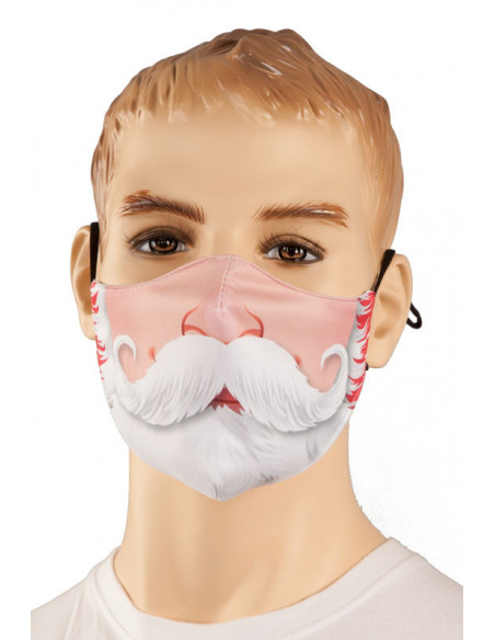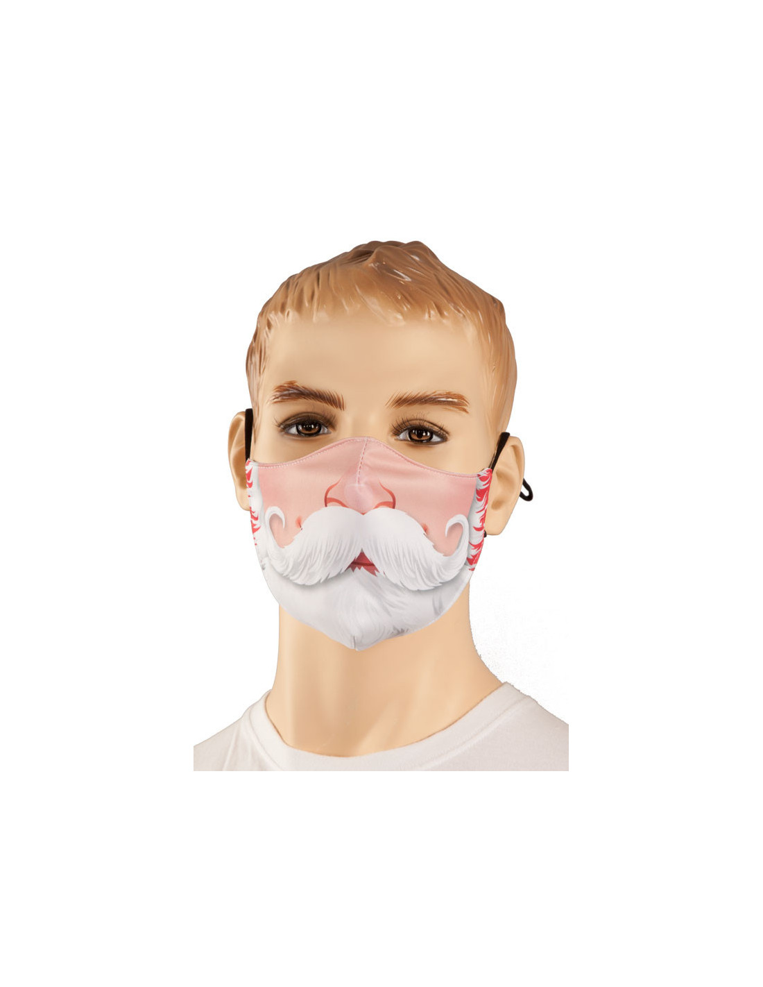 Mascarilla Papá Noel para adultos y jóvenes compuesta por dos capas de tela hidrófuga y antibacteriana, y dos elásticos alrededor de las orejas con frenos en las gomas para un mayor ajuste.