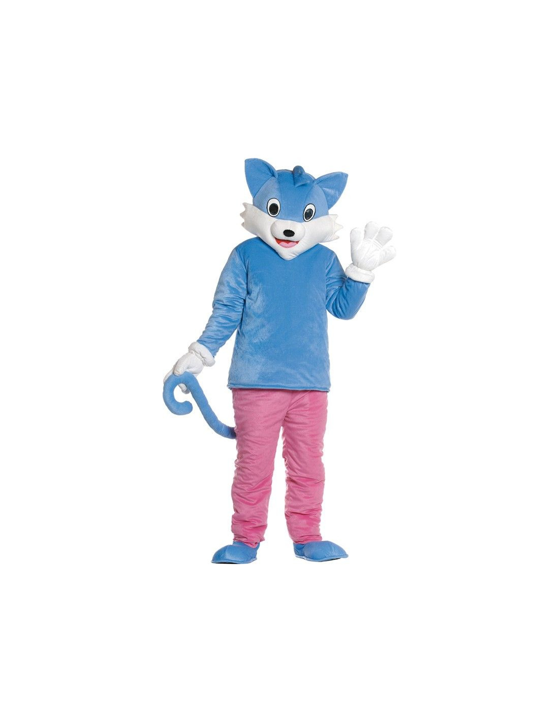 Traje de mascota publicitaria de gato azul con pantalon rosa, ideal para divertir a los mas pequeños en los pasacalles de tu localidad, las cabalgatas de carnavales o navidad, tambien es muy usado para eventos publicitarios resaltando tu marca, o si coincide con la mascota de tu equipo deportivo, puedes usar el disfraz para animar a tu equipo.