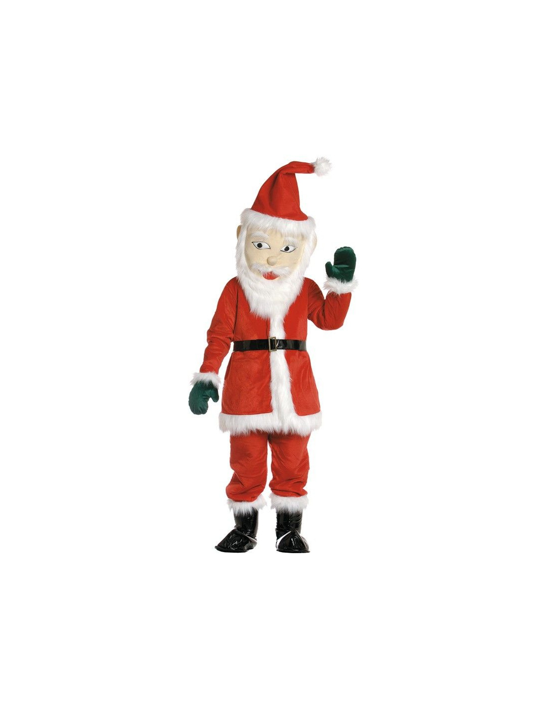 Mascota publicitaria de Papa Noel, que incluye cabeza gigante fabricada en esponja y recubierta con tejido de velux la cara, la barba fabricada en dacha blanca larga y el gorro de velux rojo, tambien en la cara tiene los detalles de las cejas, los ojos, la nariz, bigote y boca, chaqueta y pantalon rojos fabricados en velux con adornos de dacha de pelo largo blanca, cintuon de polipiel con hebilla metalica, cubrebotas de polipiel negro y guantes verdes oscuros.