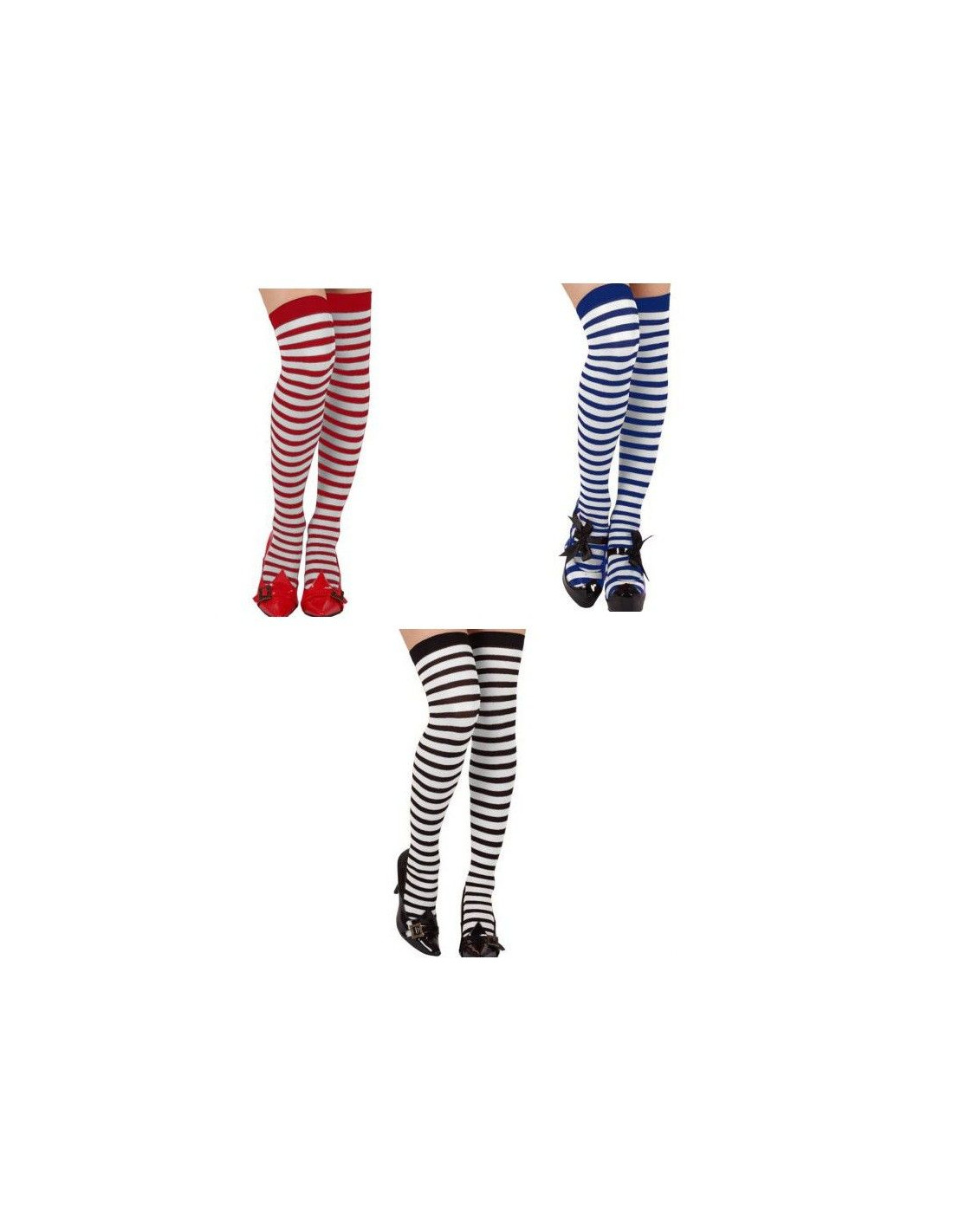 Dale el toque perfecto a tu disfraz con estas medias de rayas. Disponibles en blanco-azul, blanco-negro y blanco-rojo. Longitud hasta por encima de la rodilla. Talla única.