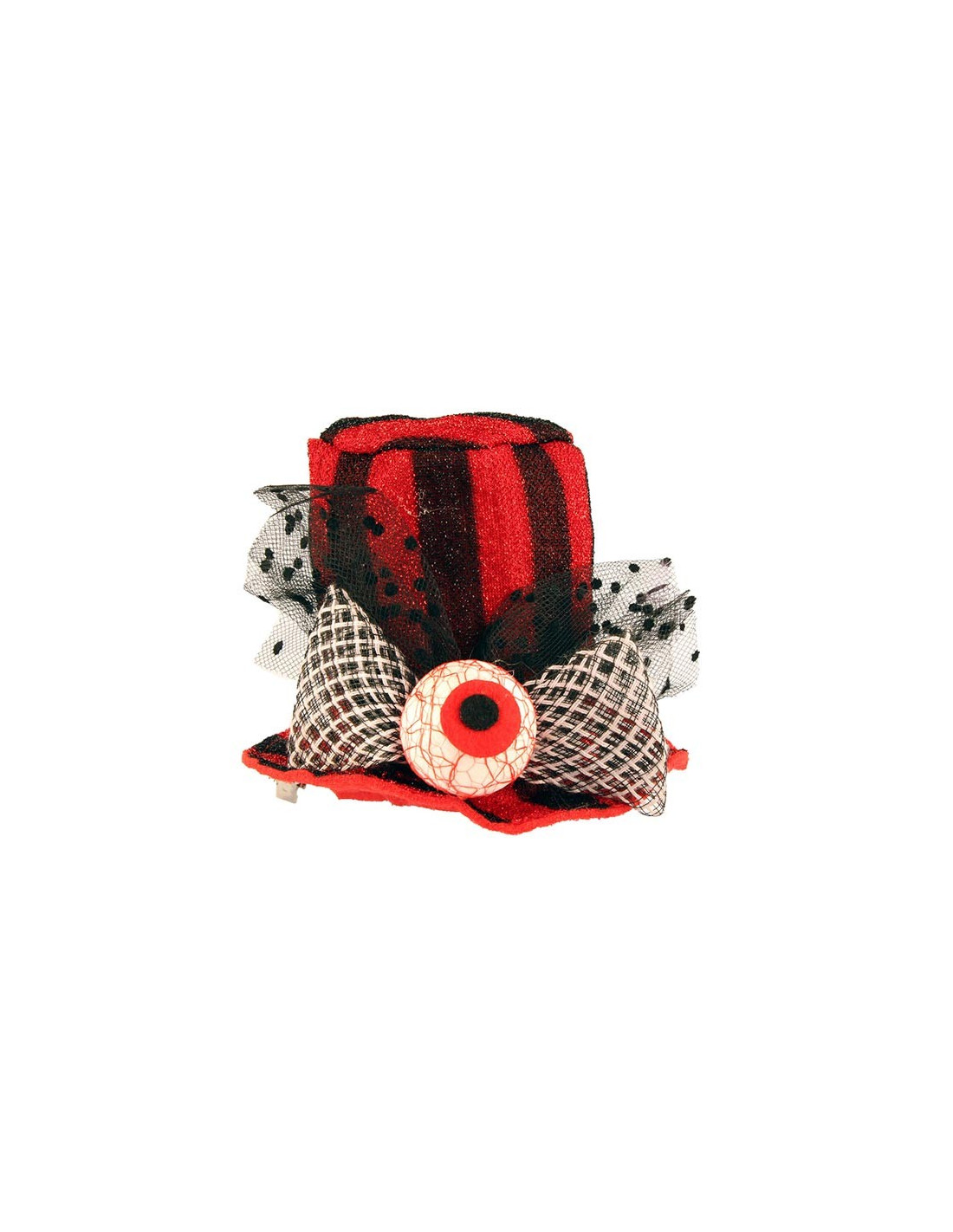 Esta mini chistera ojo Halloween tiene rayas y está decorada con un ojo y lazo de tul. La chistera mide 8cm de altura y se sujeta con pasadores.