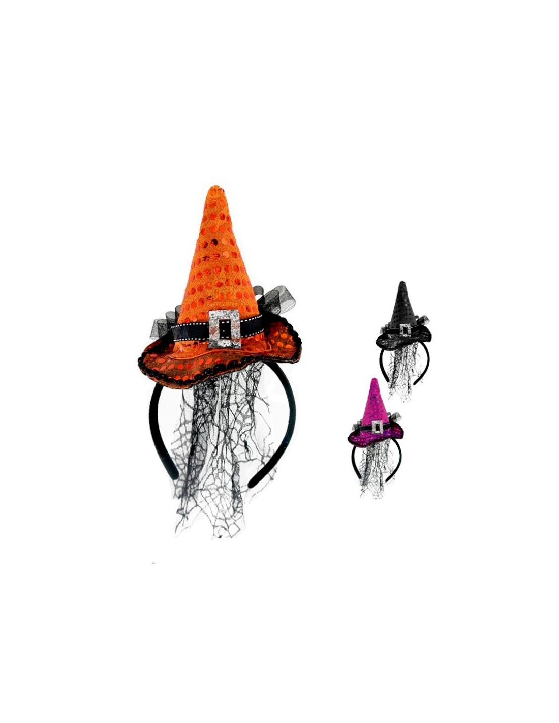 Mini gorro bruja con velo que incluye diadema con gorro y velo.
