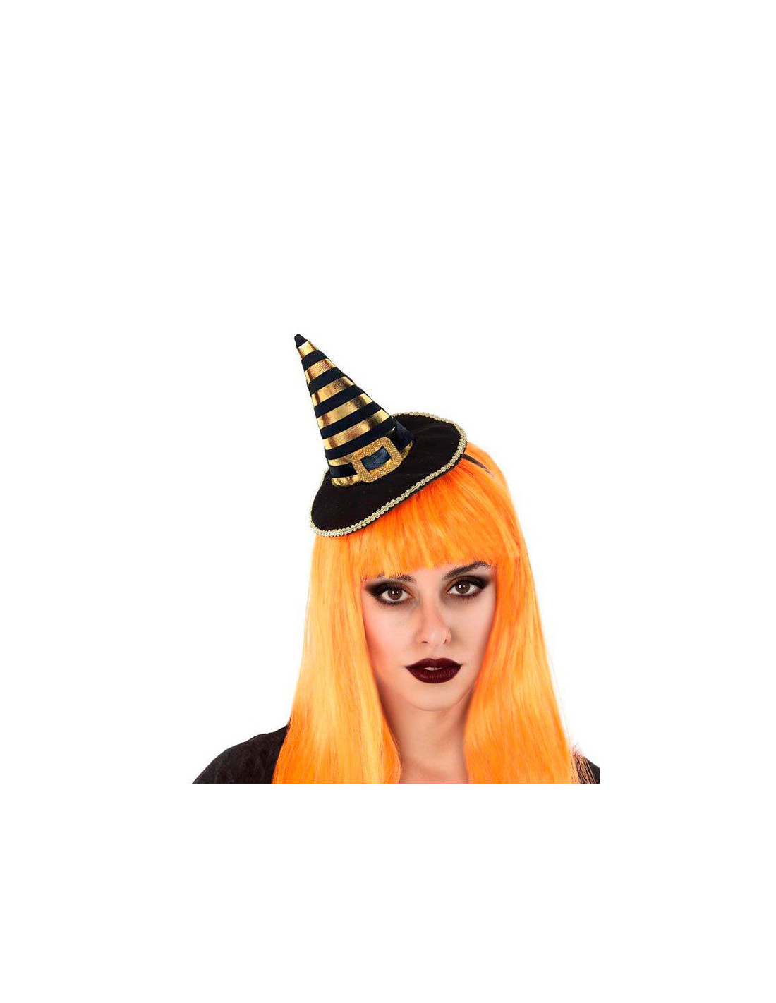 Mini gorro de bruja que incluye una diadema con gorro de bruja en un lateral.