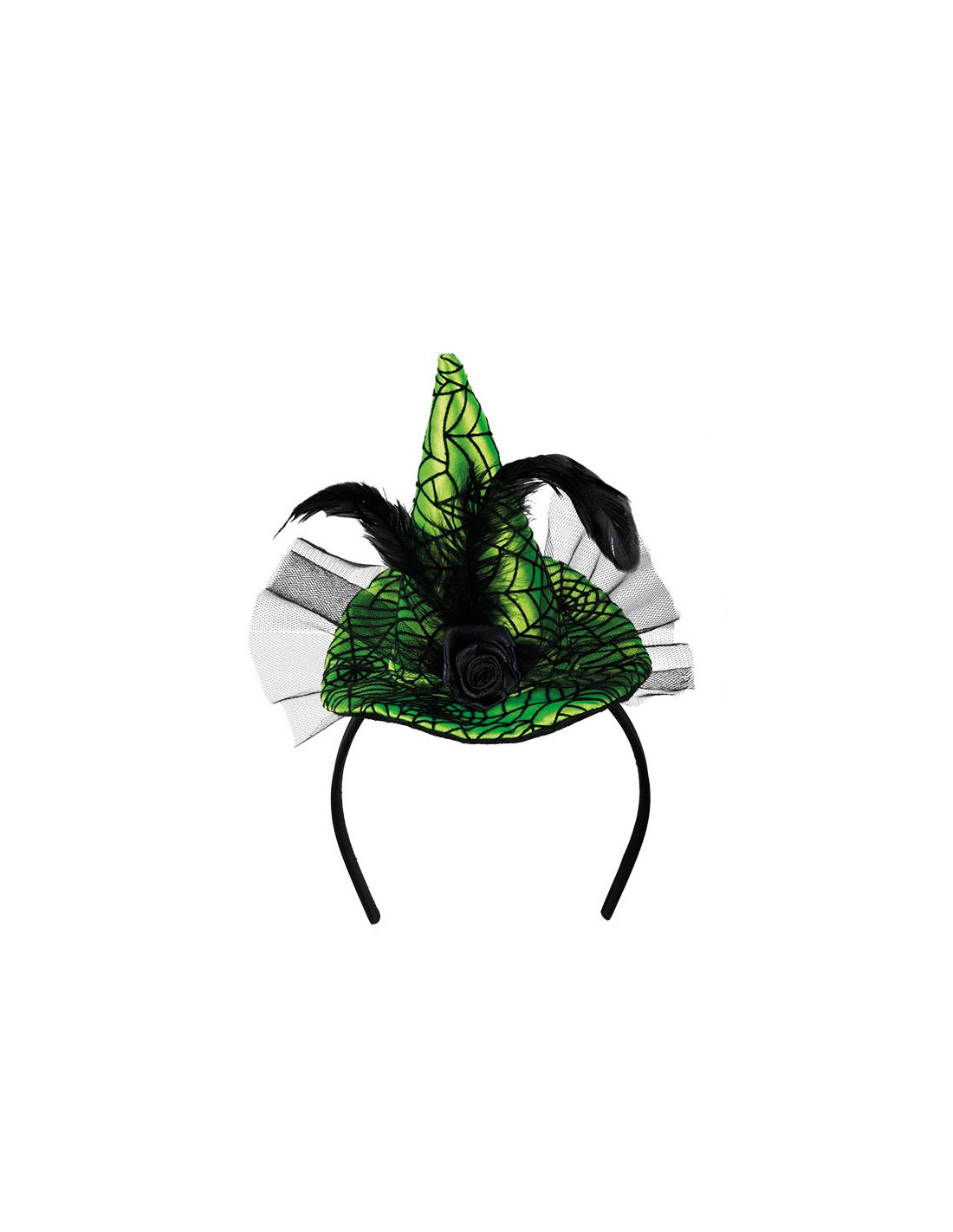 Mini sombrero de bruja telaraña que incluye diadema con mini sombrero decorado con tul y plumas negras.