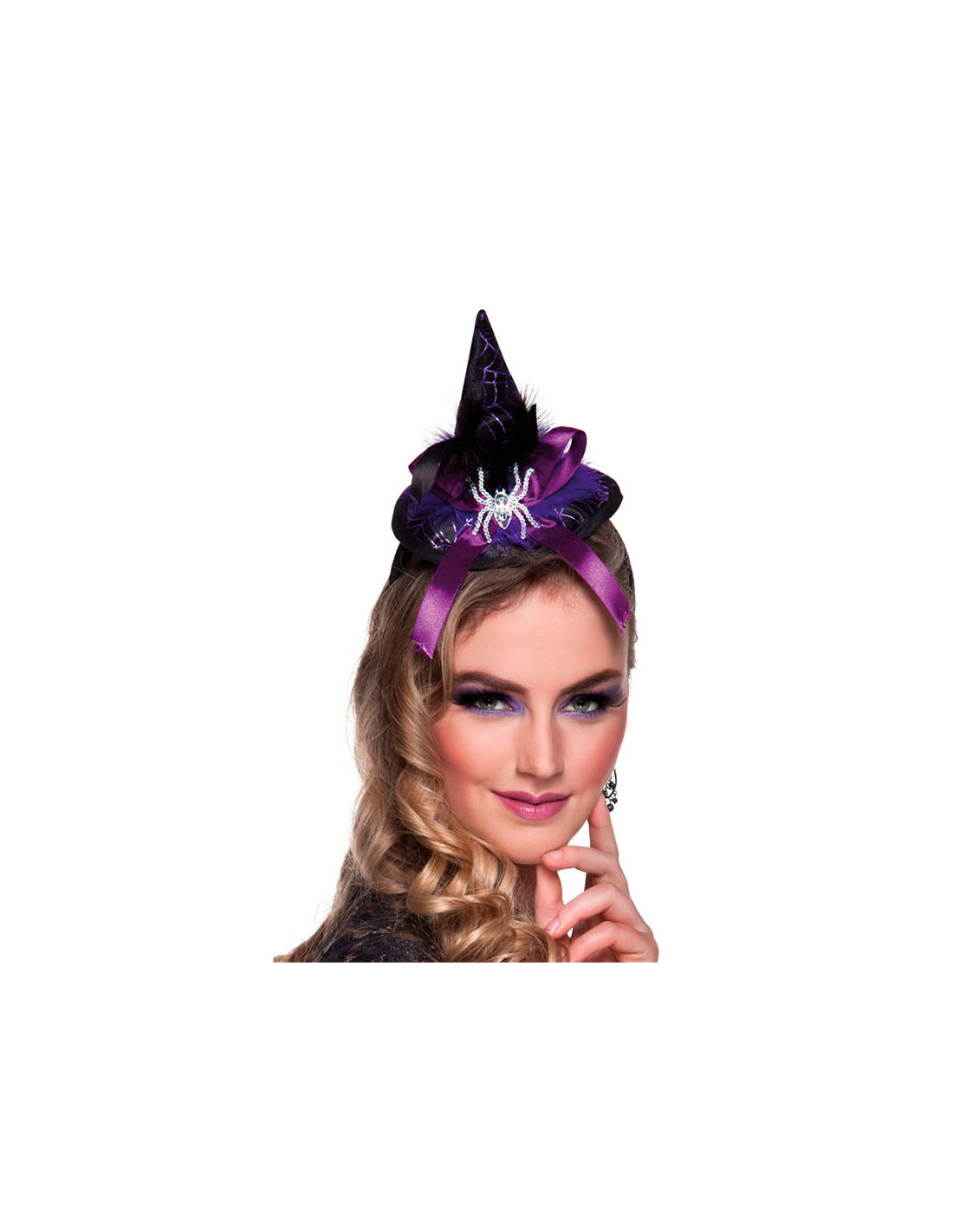 Elegante mini sombrero de bruja morado para completar tu disfraz de hechicera o bruja en halloween. Dale un toque chic a tu disfraz.