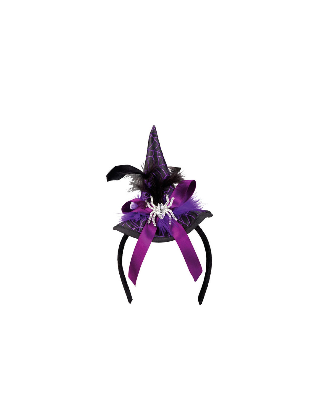 Mini sombrero de bruja morado que incluye una diadema con mini gorrito de bruja decorado.