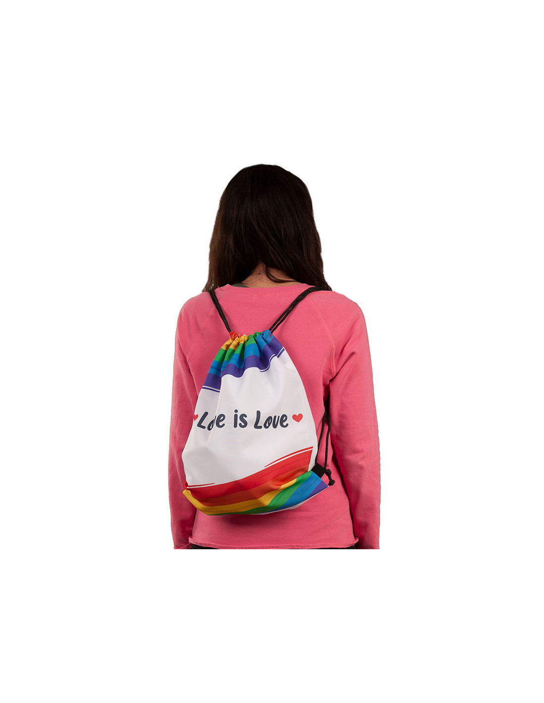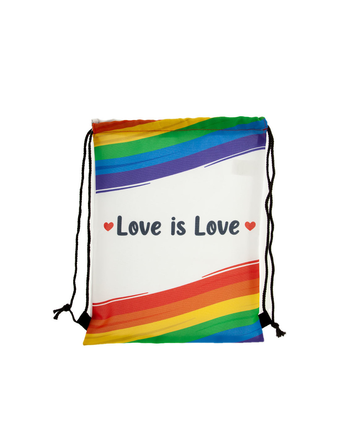Mochila orgullo Love Is Love que incluye una mochila tipo saco que mide 43x34cm.