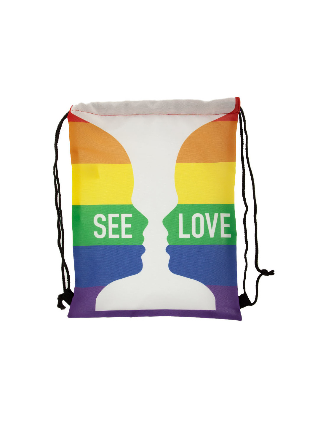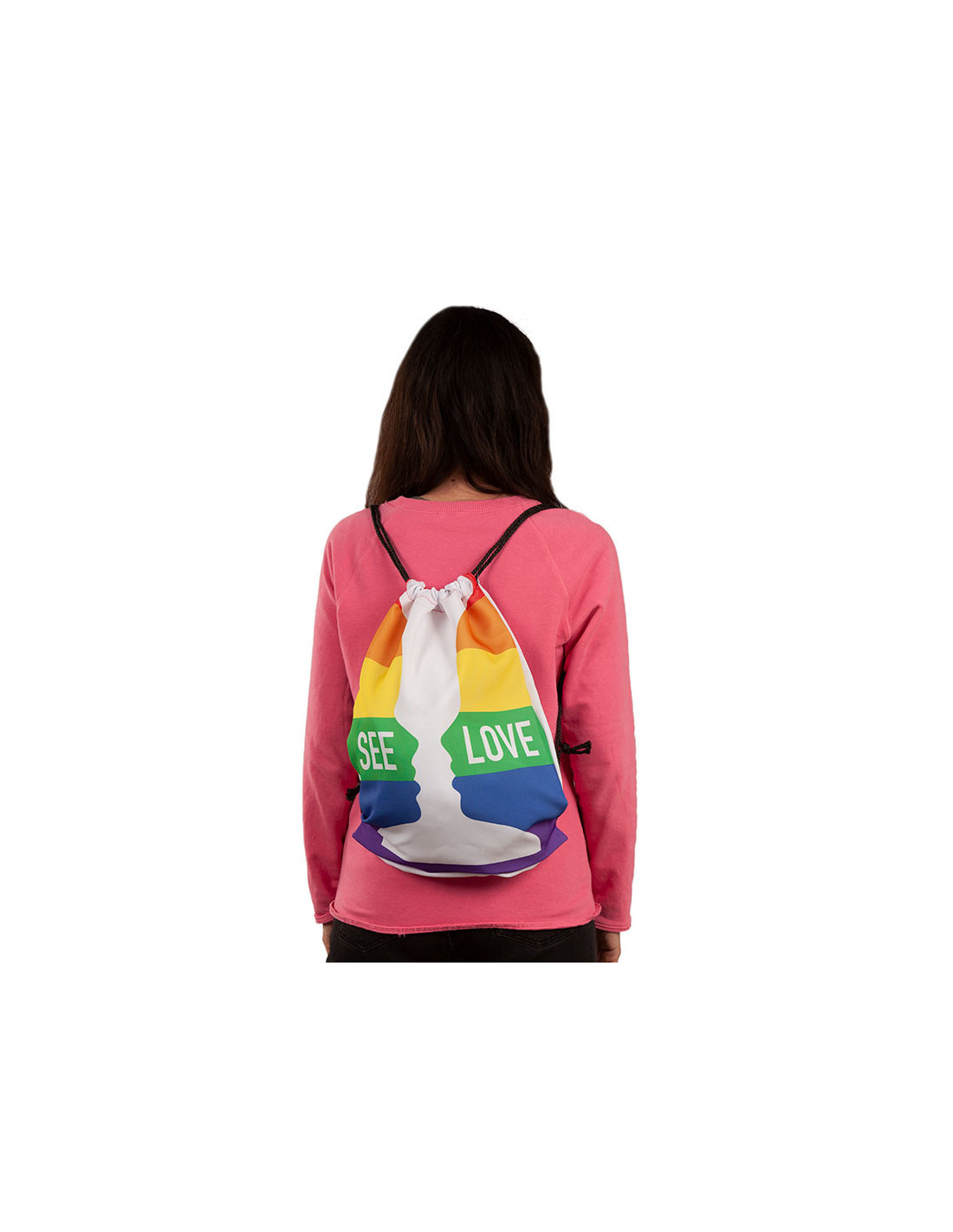 Mochila orgullo see love que incluye una mochila tipo saco estampada. Tira de las cuerdas para cerrar la mochila.