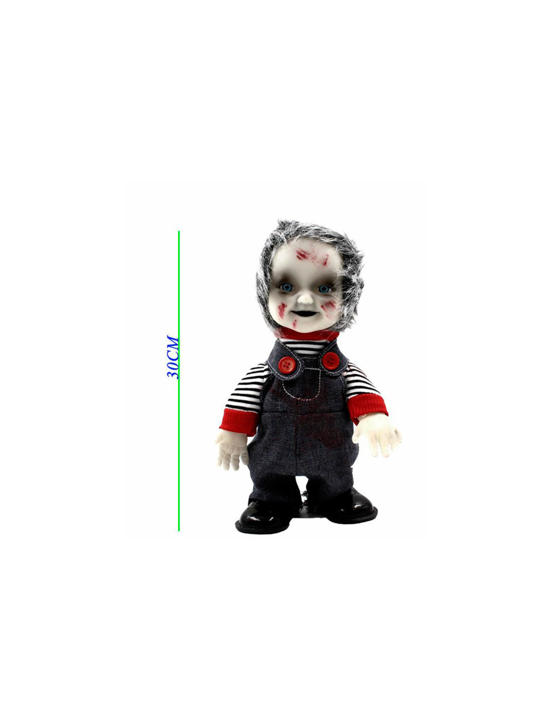 Muñeco diabólico con música y movimiento que contiene un muñeco que mide 30x20x17cm aproximadamente. Funciona con 3 pilas AA (no incluidas).