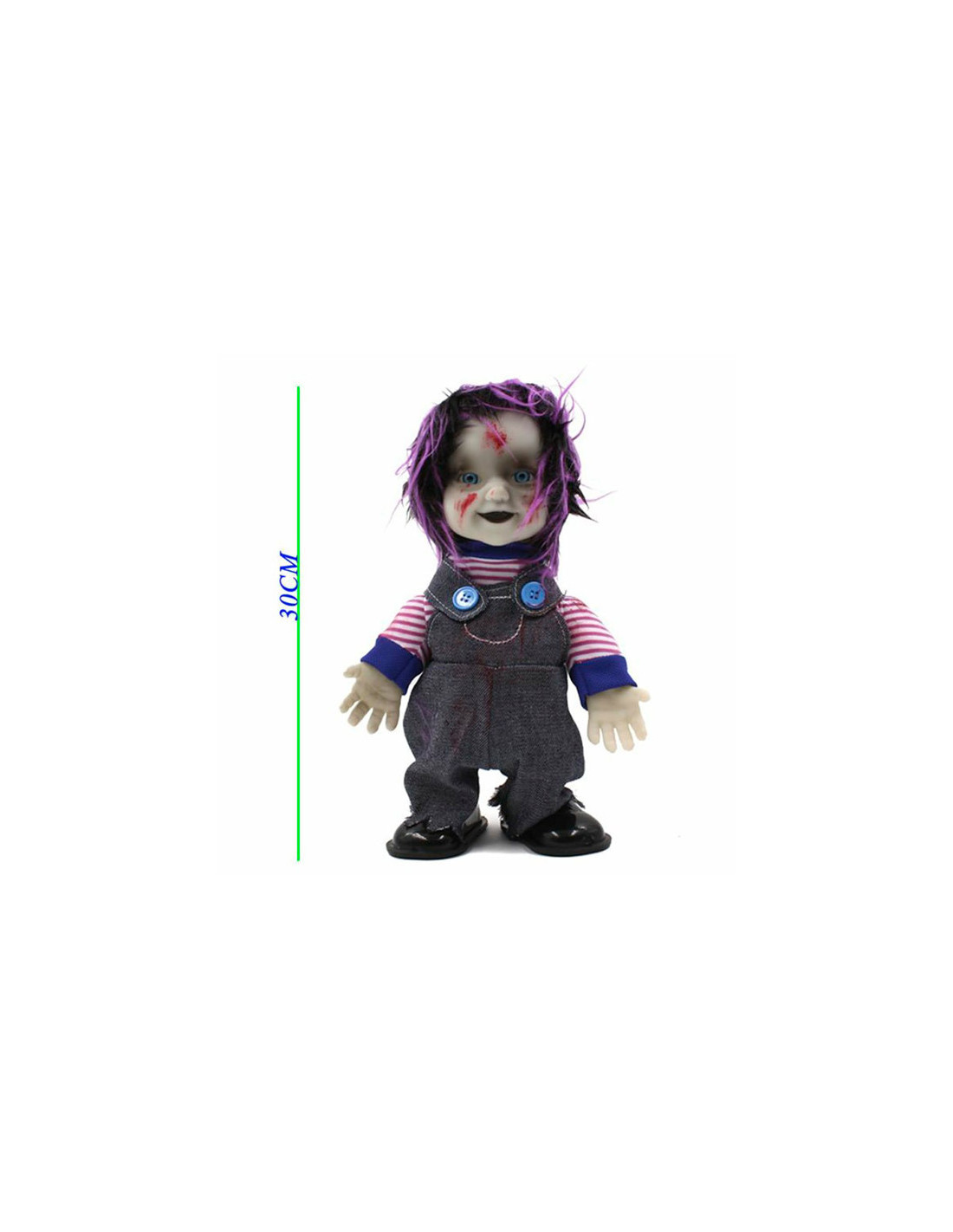 Muñeco diabólico decorativo para Halloween que mide 32x20x17cm de plástico y tela, con música y movimiento.