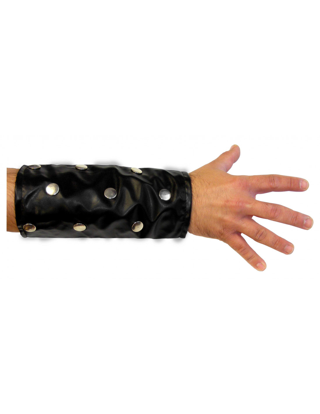 Muñequeras medievales para trajes de cruzado de la Edad Media. Fabricadas en polipiel negra está decorada con remaches metálicos plateados. Dimensiones:  20cm de largura y 25 cm contorno. Incluye un par de brazaletes.