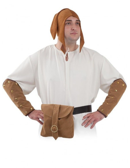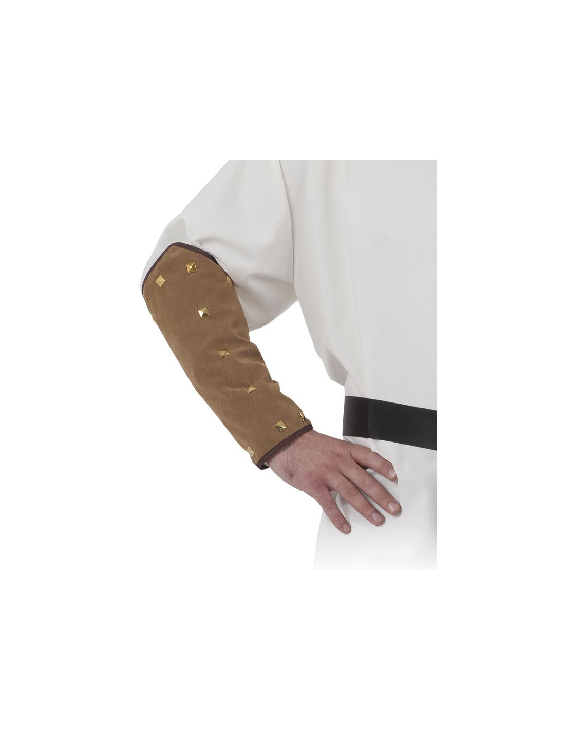 Muñequeras medievales para adulto, fabricadas en tejido no tejido de color marrón claro, con tachuelas decorativas doradas alrededor y los borden en un tono marrón más oscuro.