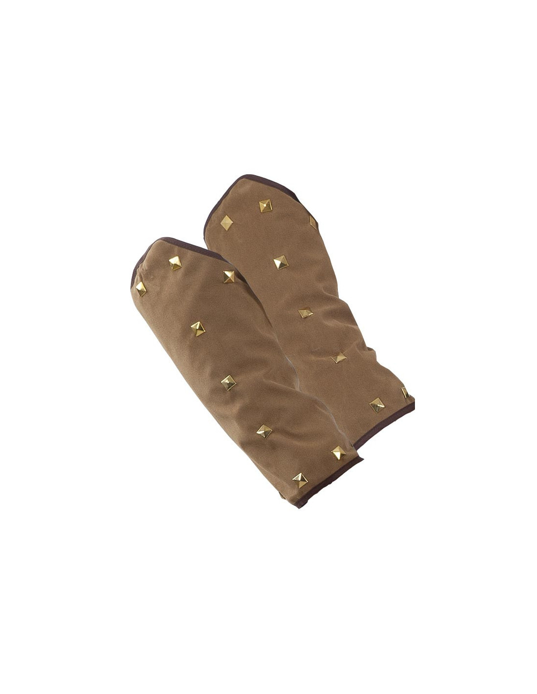 Muñequeras medievales o brazaletes, fabricadas en tejido no tejido de color marrón, con tachuelas decorativas doradas y los bordes en marrón más oscuro.